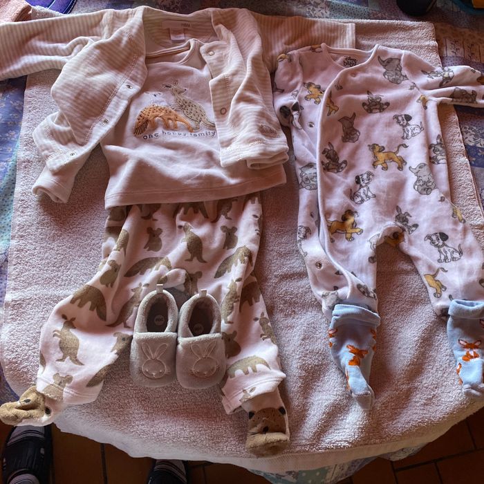 Bonjour, je vends un lot garcon hiver en taille 3 mois comprenant : -1 gilet de la marque h et m -1 ensemble velour de la marque c et à 1 paire de chaussette taille 15/16 1 paire de chausson de la taille 3/6mois 1 pyjama velours de la marque Disney de chez c et a ( les pieds ont été coupé ) 1 paire de chaussette tex taille 13/14