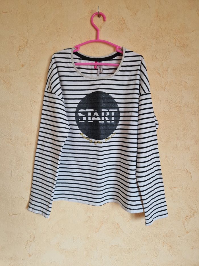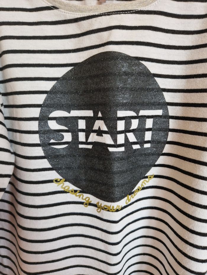 T-shirt rayé à manches longues. Taille 10 ans. Inscription "START" sur l'avant.