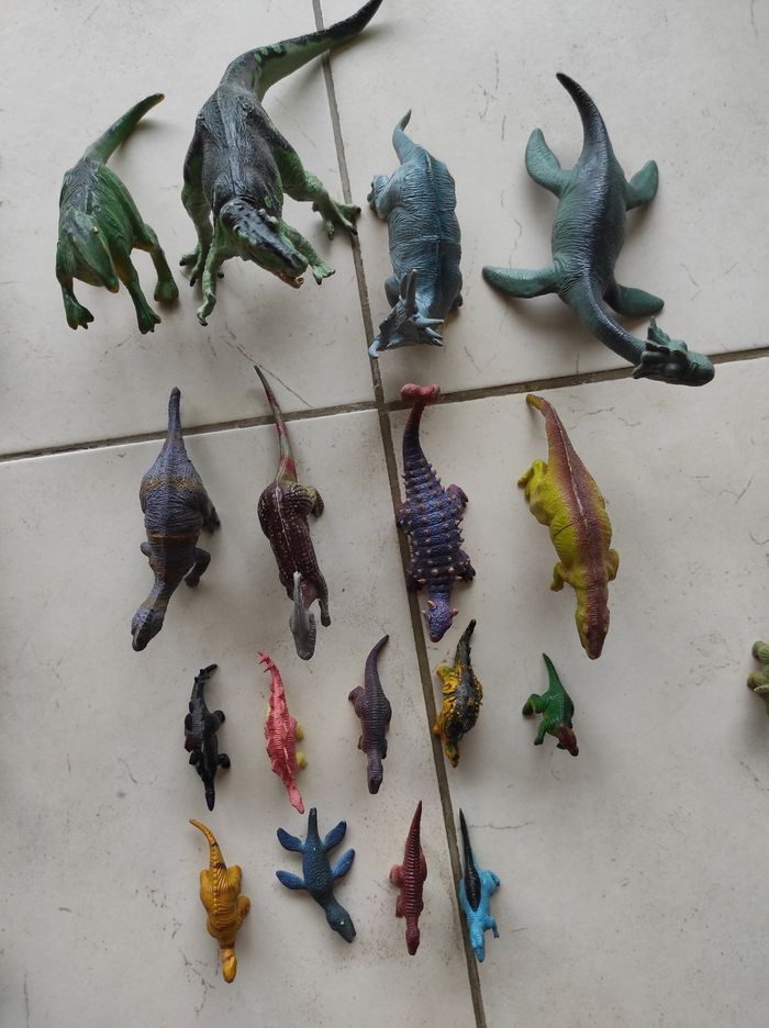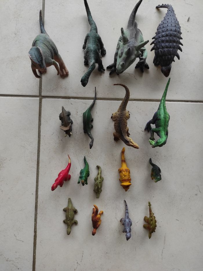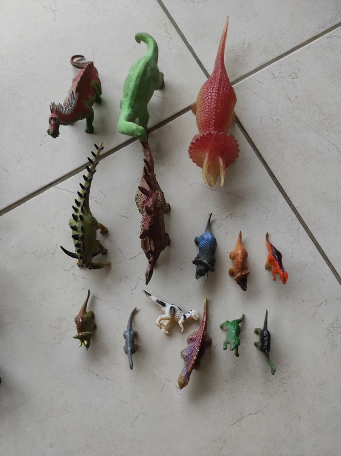 Chaque photo est un lot de dinosaures , il y a 3 lots différents. Dans chaque lot des dinosaures de différentes tailles. Quelques uns marques d'usures manque un peu de peinture Chaque photo où lot 25 euros Les 3 lots environ 48 dinosaures. 65 euros