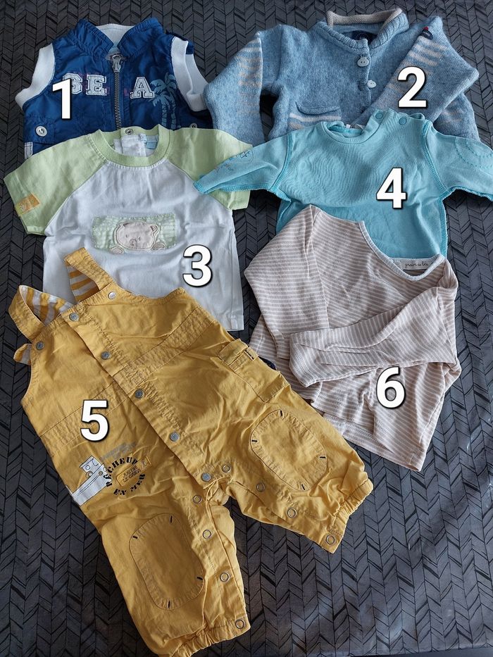 1€ pièce / 5€ le lot 1 : veste sans manche 2 : gilet tricot saint James 3 : tee-shirt manches courtes 4 : tee-shirt manches longues 5 : Salopette 6 : tee-shirt manches longues