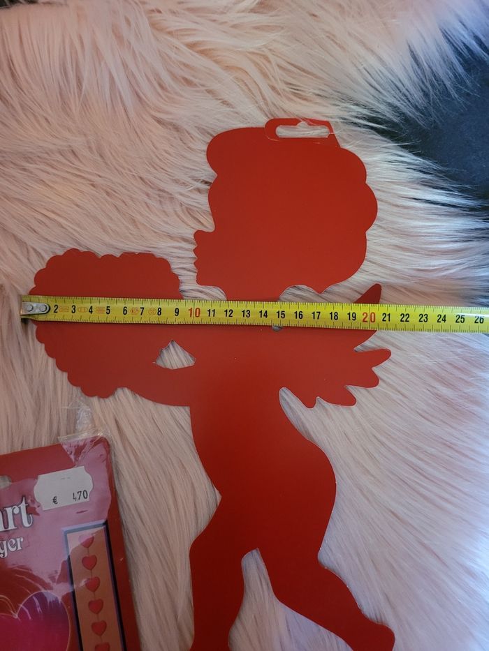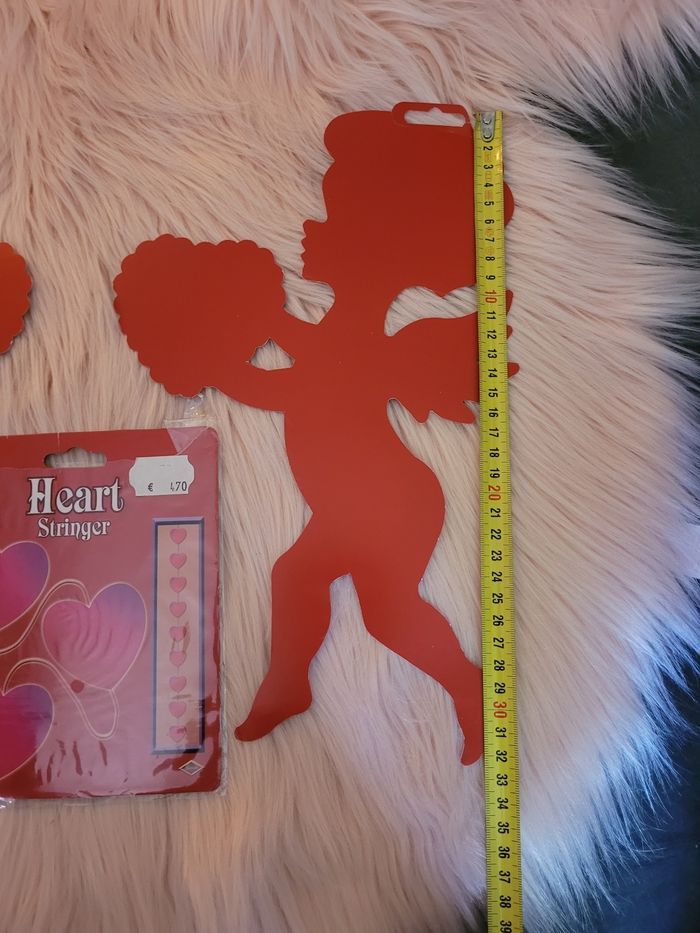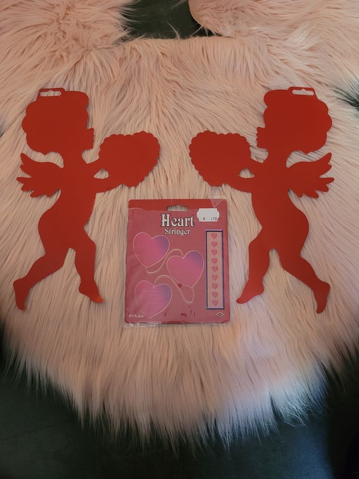 Lot décoration st valentin comprenant 2 anges rouges cartonnés, 1 guirlande cœur environ 2 mètres.