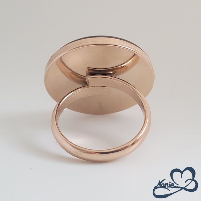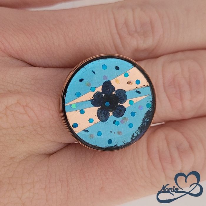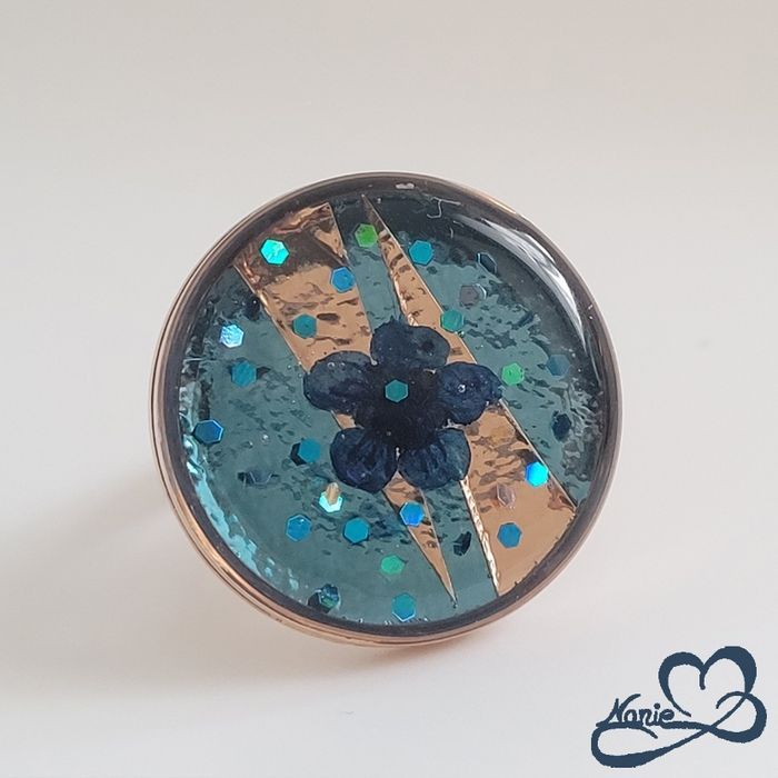 Bague ajustable ronde rosée dorée bleue avec une fleur séchée bleue - photo numéro 1