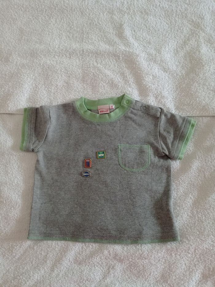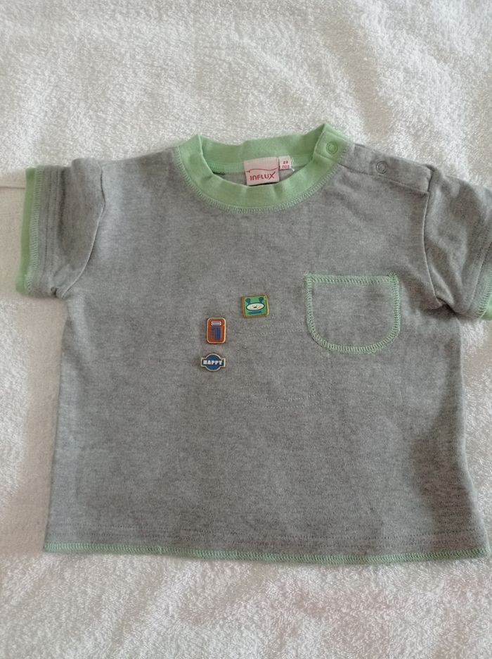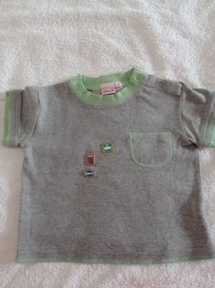 Polo manche courte avec deux boutons à pression sur l'épaule taille 24 mois marque influent avec une poche sur le devant et des petits motifs voir photos couleur gris et vert clair pur coton