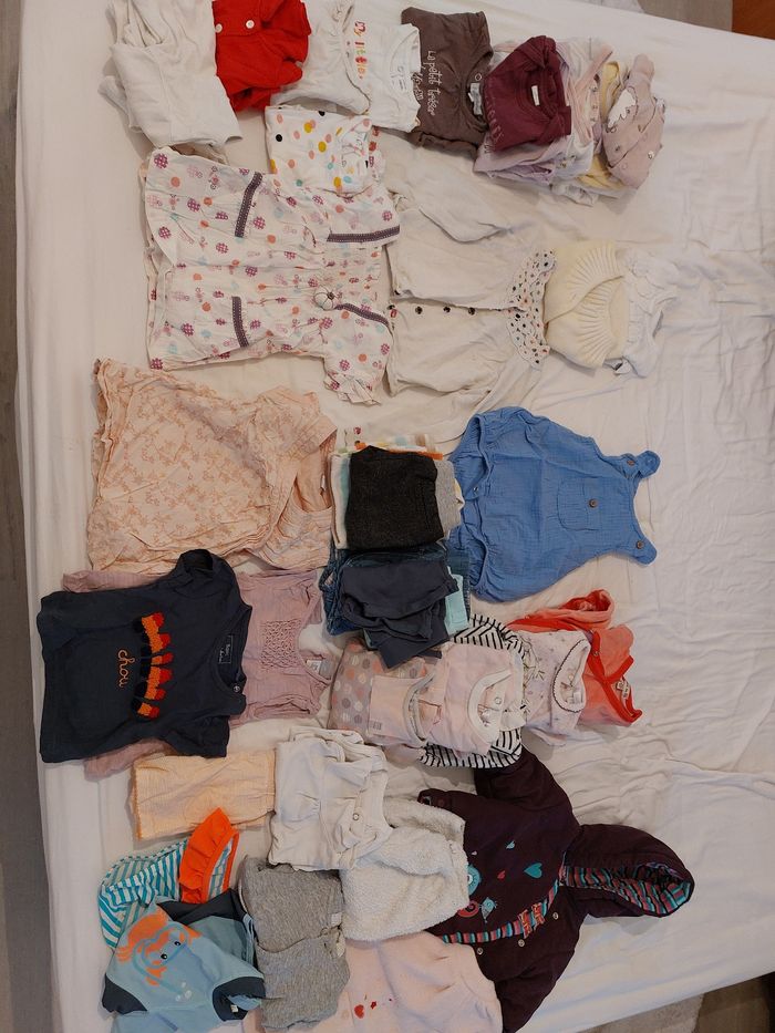 Vends lots de vêtements bébé taille 3 mois. Assortiment de body, tee-shirt, robes, tenues de bain, pyjamas, gilets...