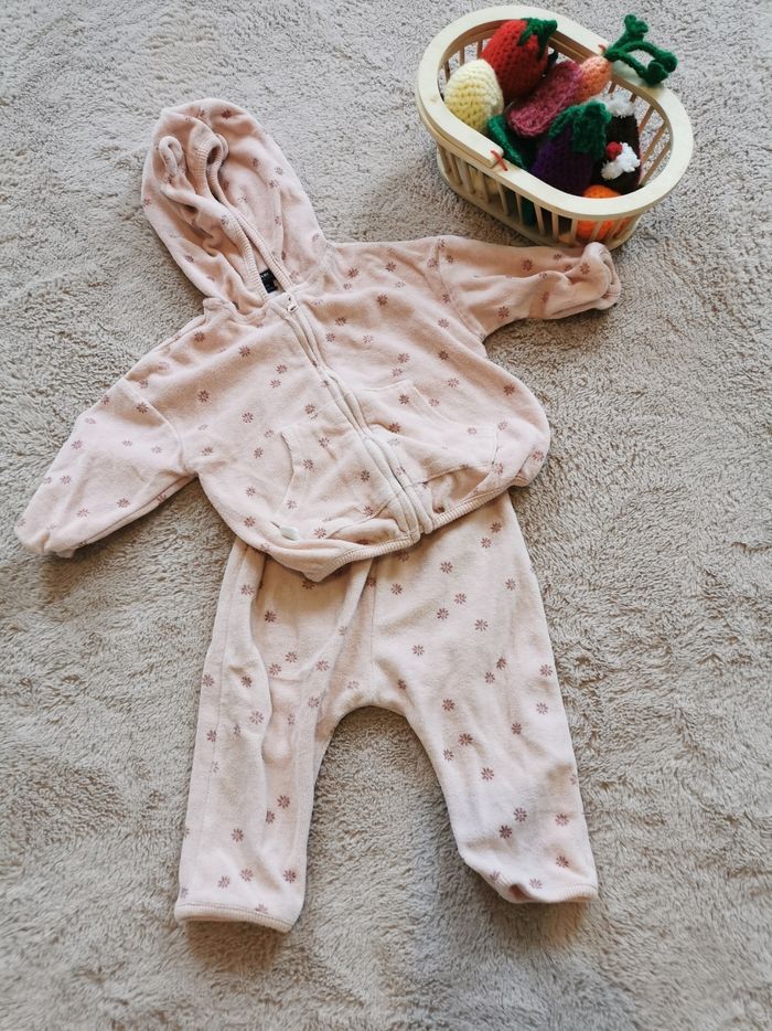 Ensemble pantalon +veste velours rose Très bon état 12 mois Kiabi