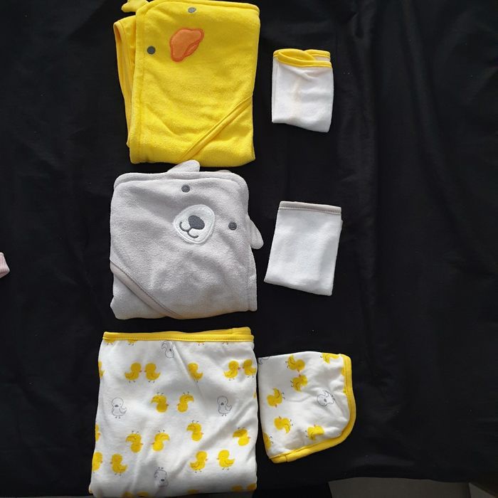 Complètement neuf ! 2 serviette à capuche + 1 serviette + 3 paires de gants toilettes. 85% de coton - 15% polyester laver en machine à 30°c