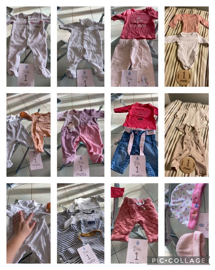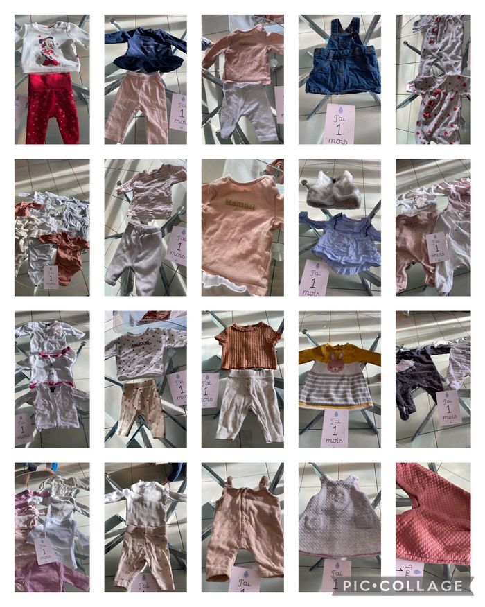 Gros lots vêtements 1 mois fille Revien a moins de 1.30€ piece 40 bodys 2 bonnet 13 pyjamas 2 salopette 10 haut 11 pantalons 4 robe 1 gilet manches courtes 1 tee shirt neuf jamais porter 3 gilet / brassière 87 pièce au total