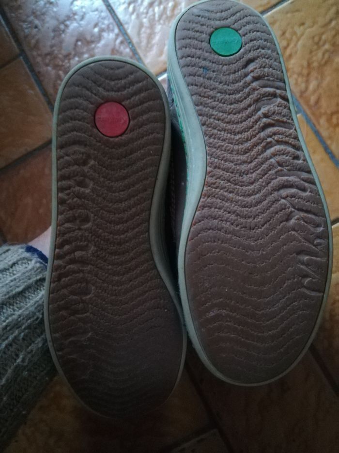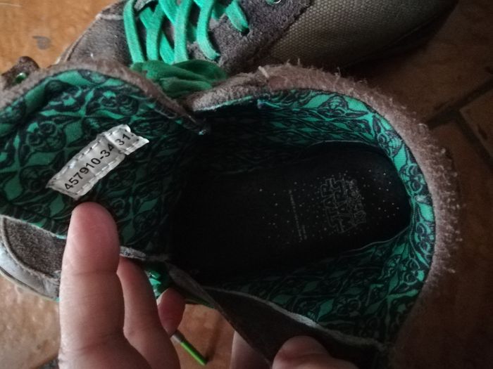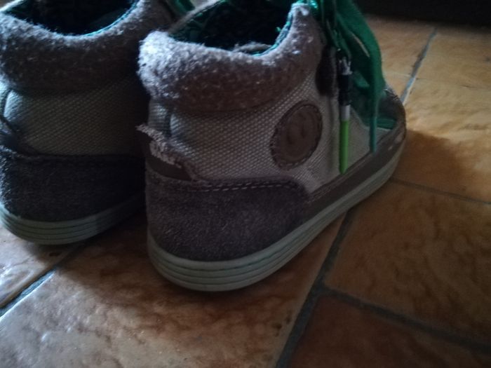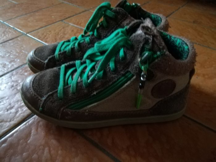Baskets montantes ou bottines En Cuir et tissu marron Lacets verts Fermeture éclair sur le côté pour un enfilage facile et rapide, avec tirettes sabre laser Modèle maitre Yoda Peu portées mais quelques marques d'usure visibles sur les photos (je passerai un petit coup de cirage pour la vente)