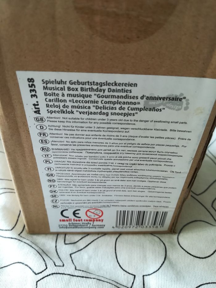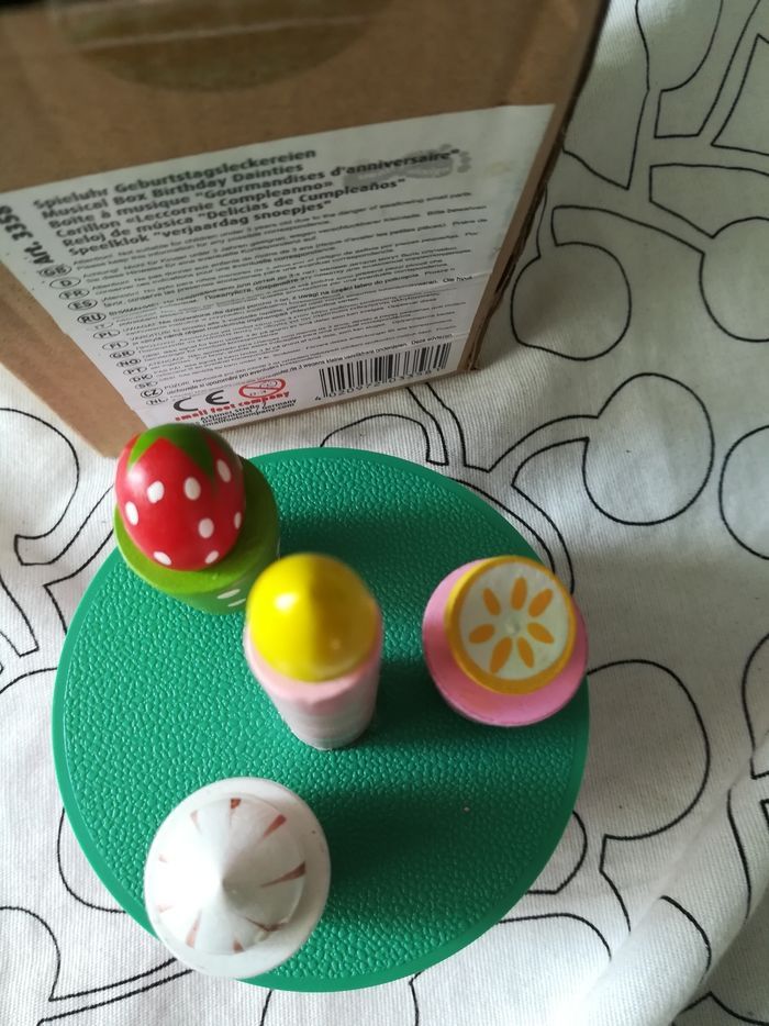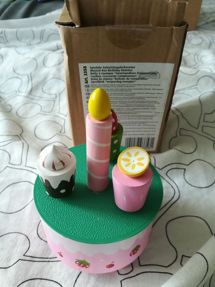 Tout en bois peint 13 cm x 8 cm Les gâteaux et sa bougie tournent au rythme de la musique d'anniversaire Dans son carton d'origine Idéale pour offrir ou en décoration