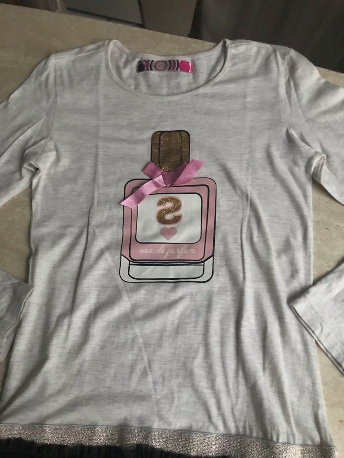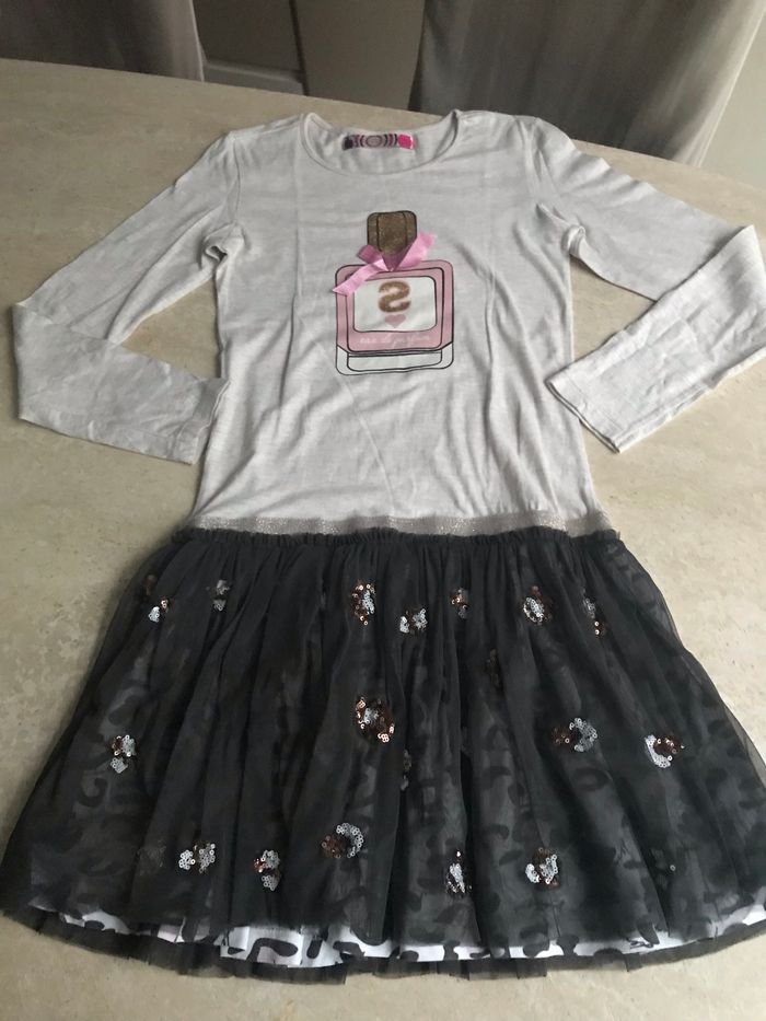 ROBE DE LA MARQUE "DESIGUAL". Coloris : Ecru pour le haut & gris pour le bas. Taille : 11/12 ans (146/152 cm). Vérifiez toujours les mesures mentionnées ci-dessous car d'une marque à l'autre, les dimensions peuvent varier. Carrure : 32 cm d'une couture de l'épaule à l'autre. 37 cm d'une couture de l'aisselle à l'autre. Longueur des manches : 56 cm du côté extérieur (jusqu'à la couture de l'épaule) et 46 cm du côté intérieur (jusqu'à la couture de l'aisselle). Longueur de la robe : 80 cm. Encolure arrondie. Motif imprimé sur le haut de l'avant (les parties dorées sont pailletées et scintillantes). Petit noeud rose décoratif en satin cousu sur le haut de l'avant. Bas en tulle (2 épaisseurs de tissu). Doublée dans le bas d'un tissu imprimé. Matière : Coton, viscose & polyamide. D'occasion en très bon état (pas de taches, ni de trous ou d'accrocs).