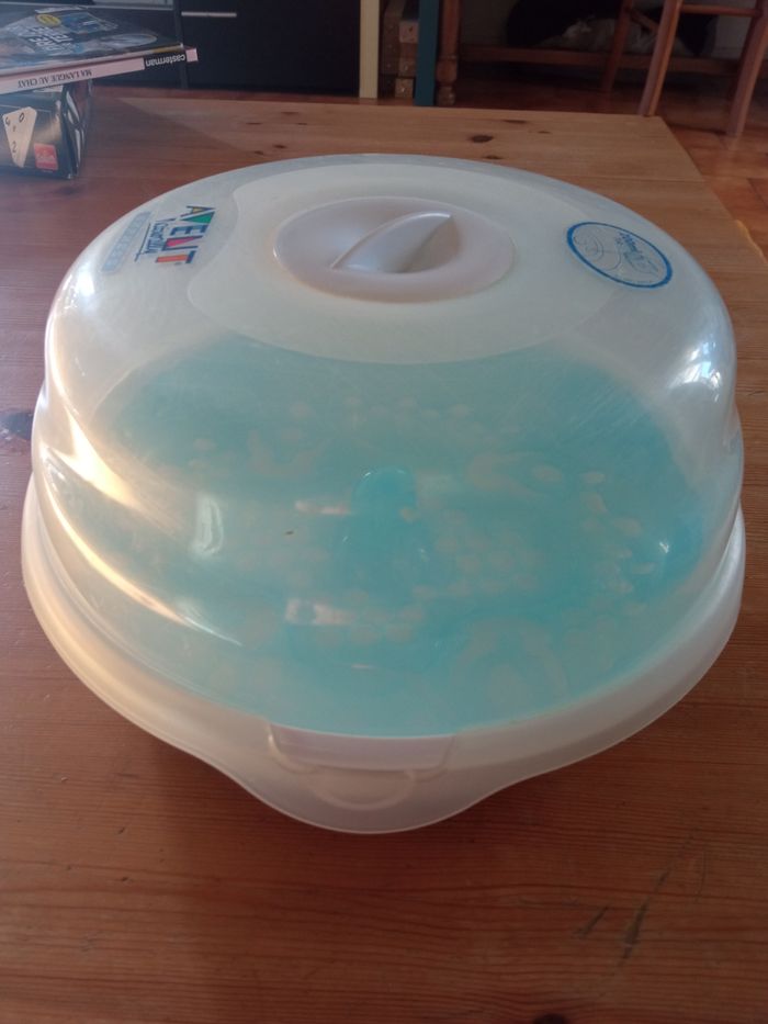 Stérilisateur avent naturally express. S'utilise au micro onde. Bon état. Le couvercle a un défaut (voir photo) mais ne gêne en rien le bon état de marche de ce stérilisateur.