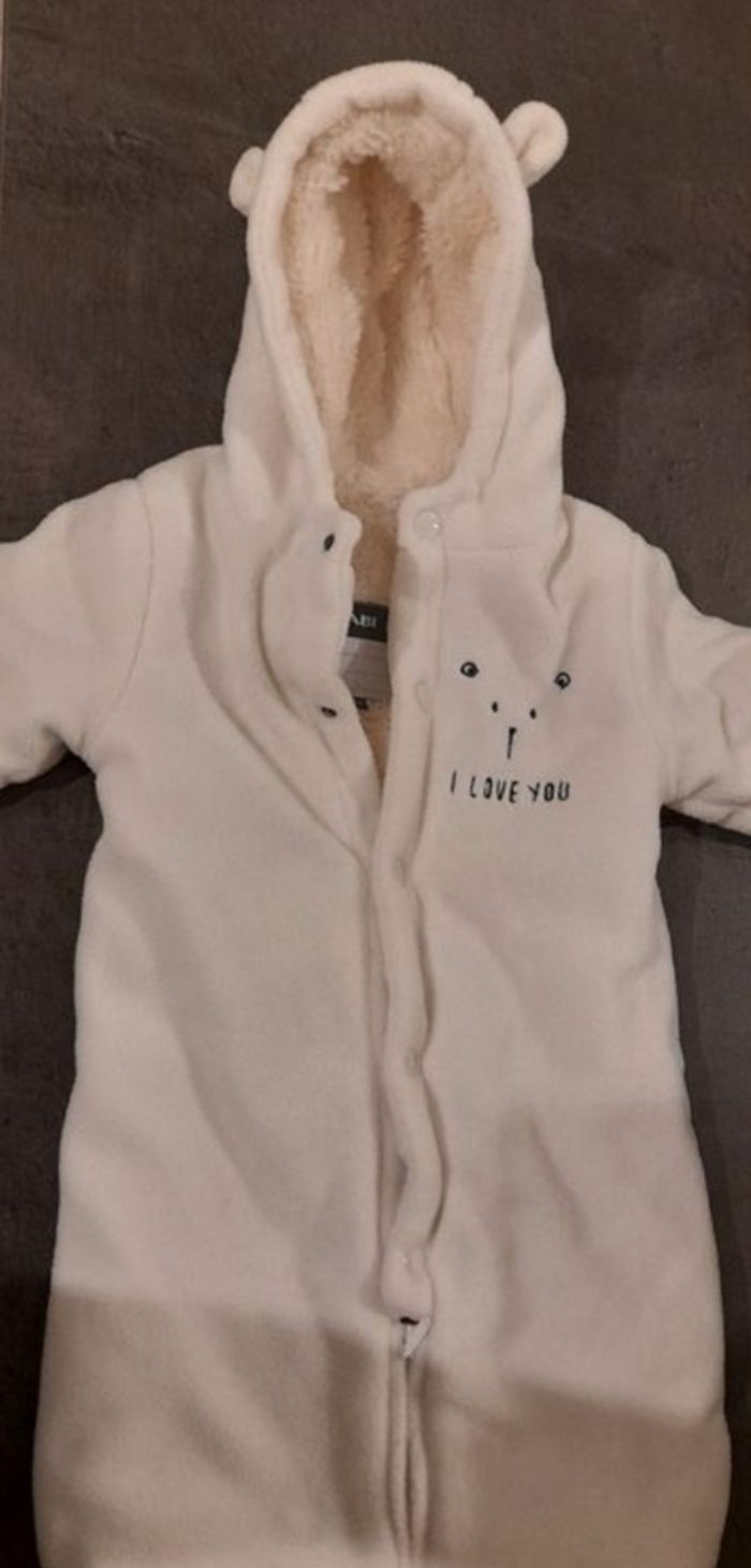 combipilot beige polaire 3 mois de Kiabi. Moufle intégré et pieds séparable. Porté 1 saison en très bon état aucun défaut. Idéal hiver !