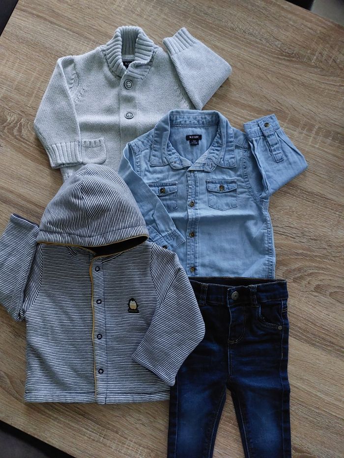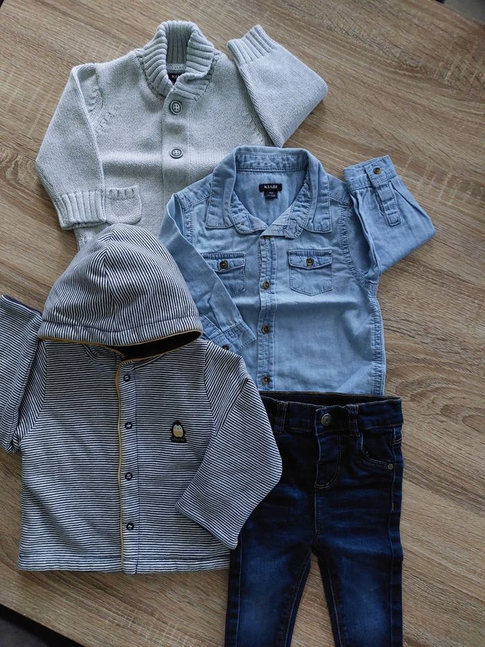 Lot vêtements garçon comprenant 1 gilet réversible Absorba, 1 chemise Kiabi, 1 jeans 👖 et un gilet gris Kiabi.