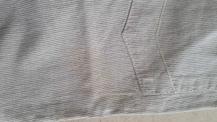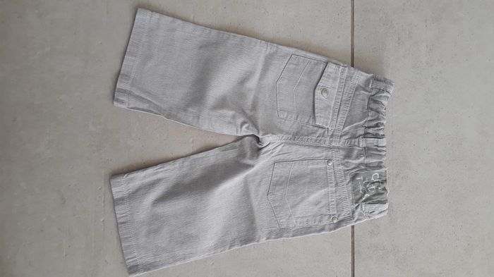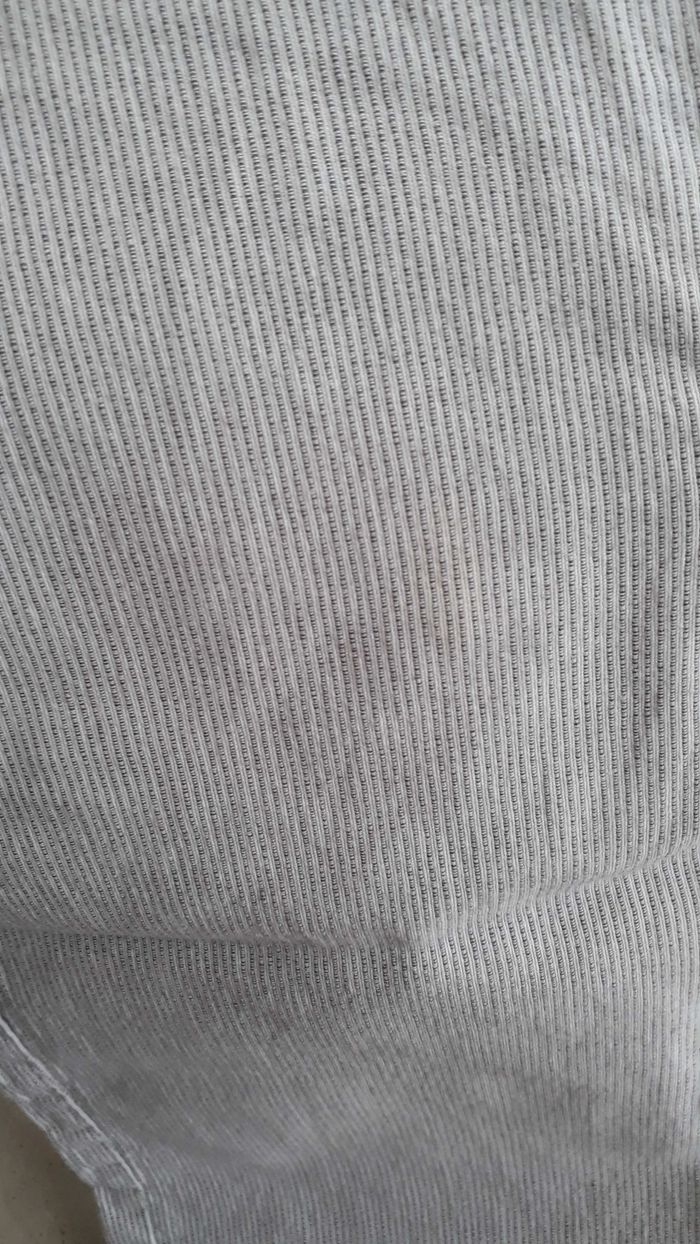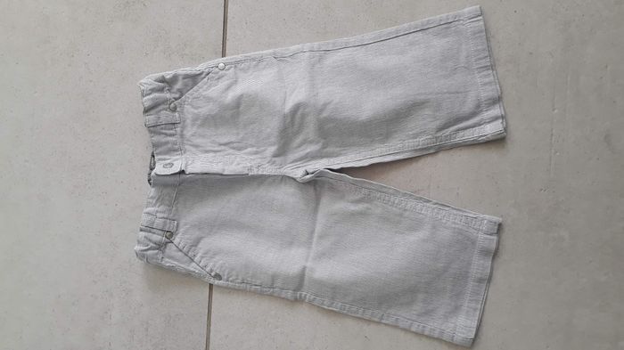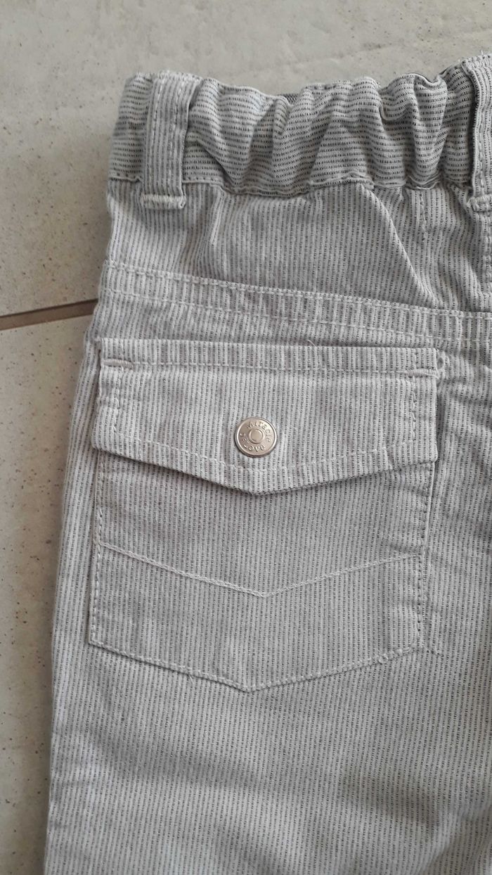 Pantalon fin blanc rayé gris 2 poches sur le devant et 2 derrière Bouton pression et possibilute5de régler la taille avec un système d'élastique 2 tâches derrière (voir dernieres photo)