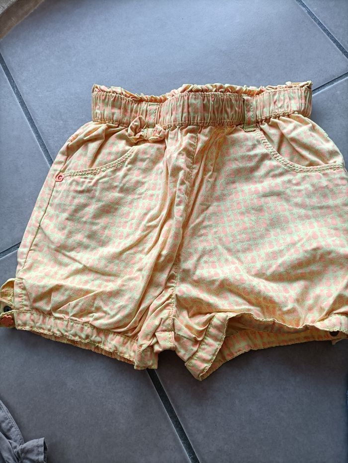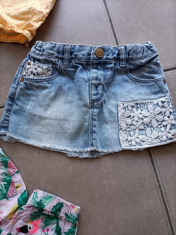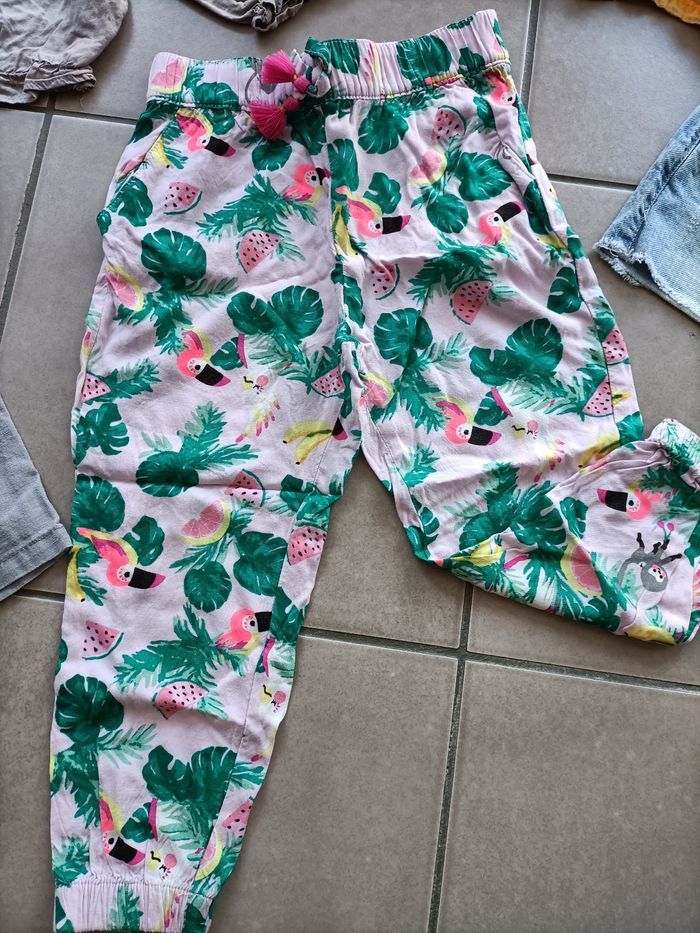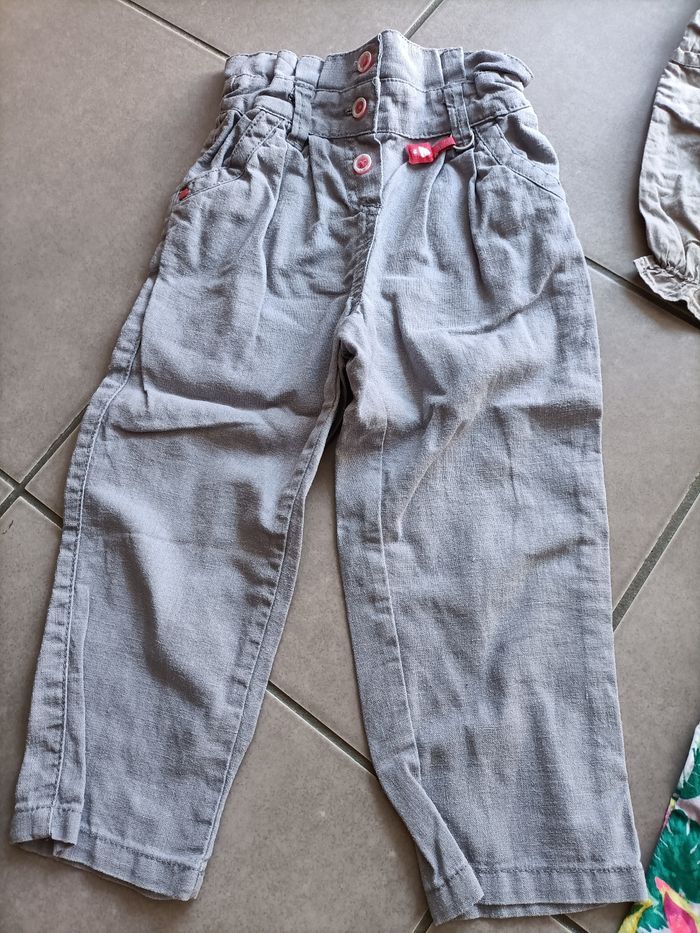 Lot de bas fille, 2 ans , en très bon état. 1 pantalon en lin gris 1 pantalon fluide rose a motifs 1 bermuda/sarouel taupe 1 short jaune a motifs 1 jupe en jean+dentelles.