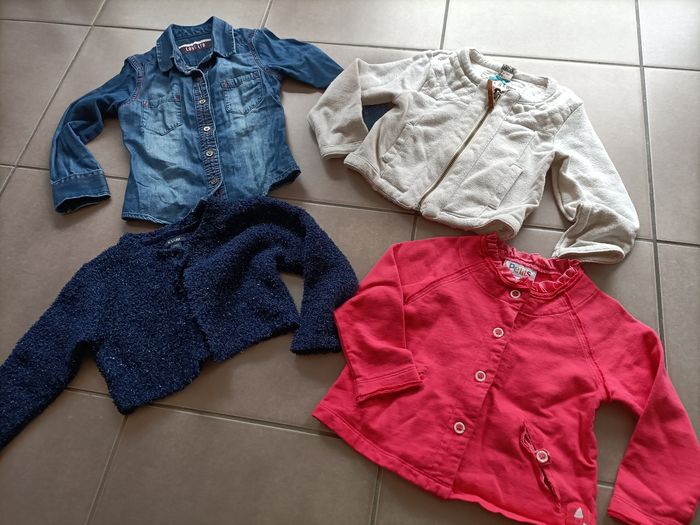 Lot de gilets/vestes fille, 2 ans, très bon état. 1 chemise en jean 1 veste écru tape à l'oeil 1 gilet Kiabi bleu a paillettes 1 gilet rose