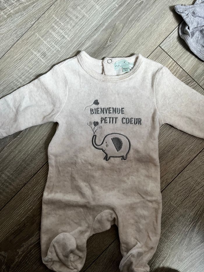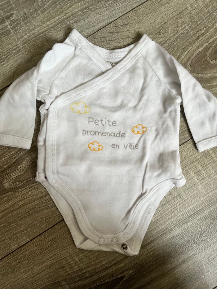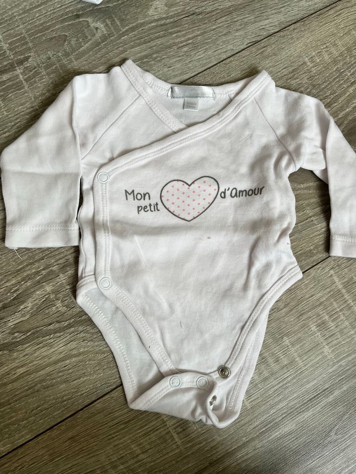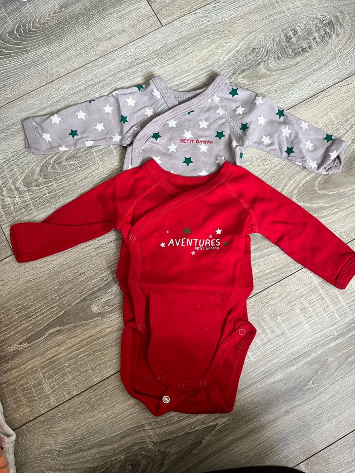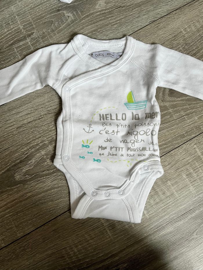 Un lot de 7 bodies 1 mois en bon état + un pyjama naissance , les deux bodies petits bateau sont comme neuf Mixte . Différents marques , les petits cailloux etc ..