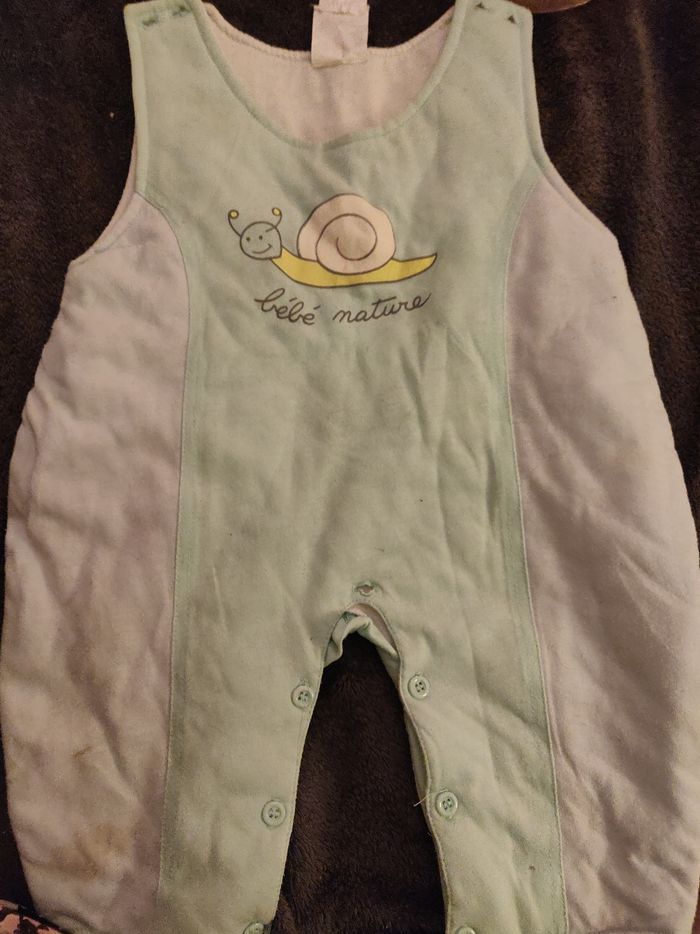 Combinaison bleu, avec escargot Tâche légère jaune au niveau de la cheville gauche Taille 12 mois