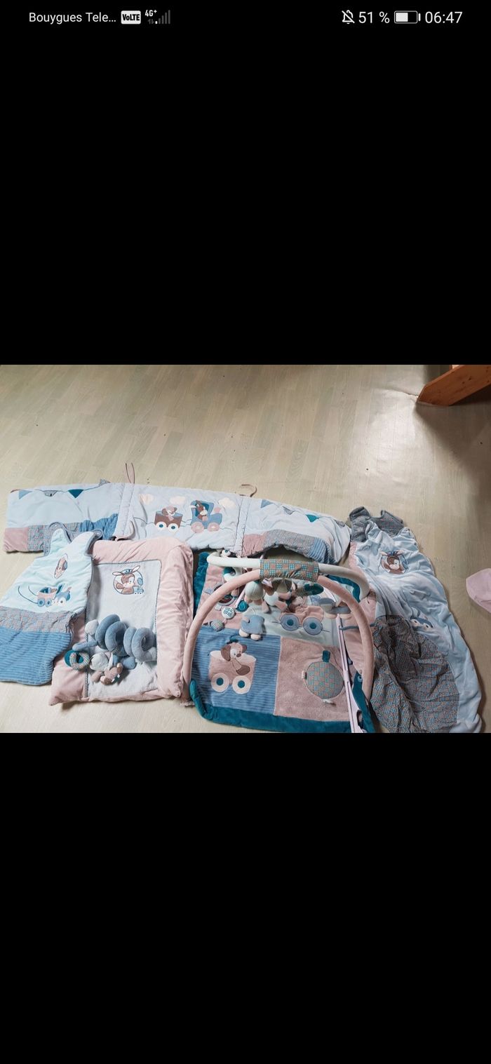 Tour de lit, turbulette jusqu'à 6 mois, turbulette à partir de 6 mois, matelas et housse à manger, tapis d'éveil (vendu) , spirale, mobile musical.... Le tout en très bon état.