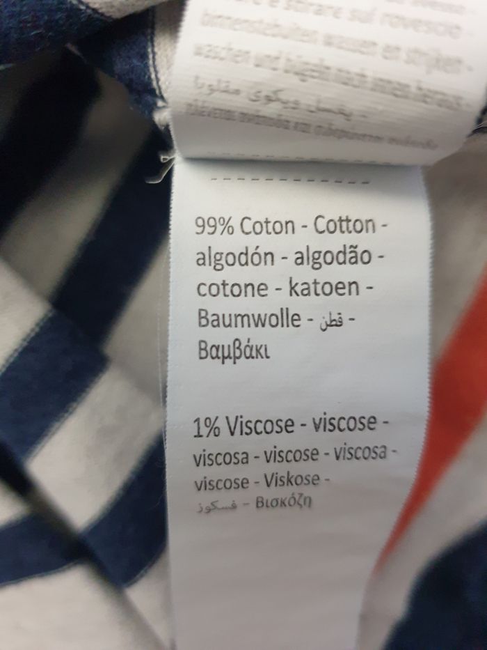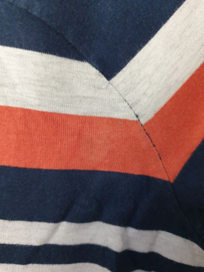 T-shirt manches longues en jersey lourd à rayures avec texte imprimé sur la manche gauche. Imperfection (5ème photo) légère décoloration sur la manche droite. Prix neuf: 16,99 euros.