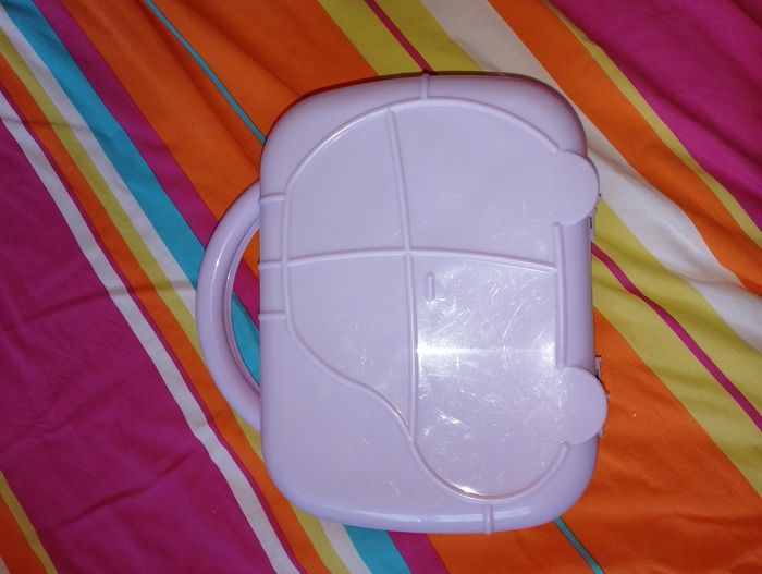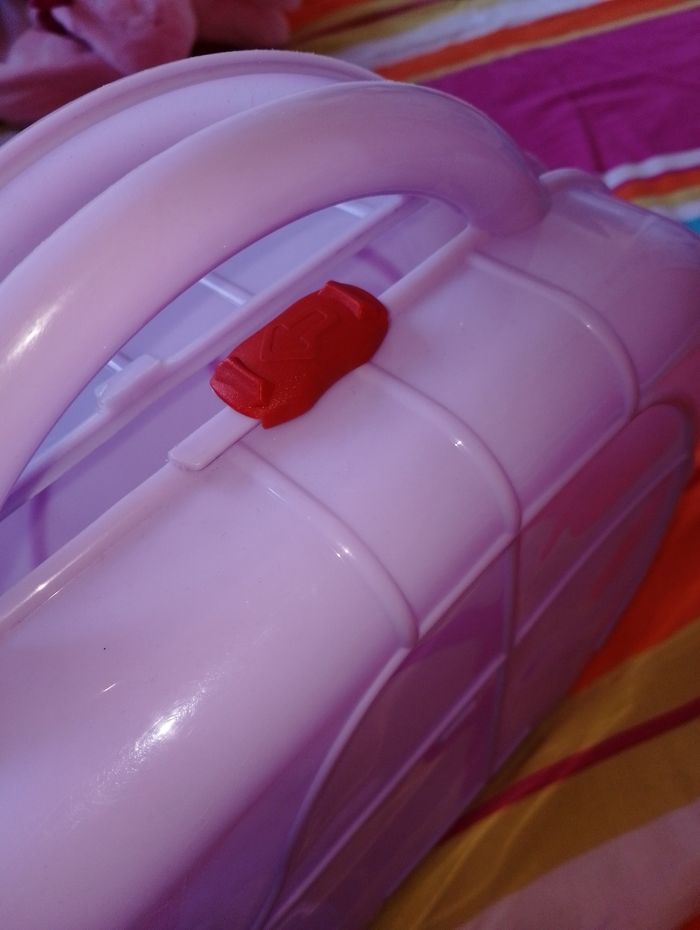 Boîte où valise de rangement, transport 27x26cm Couleur violet clair Motif voiture Se ferme par le clips rouge qu'il fait pivoté