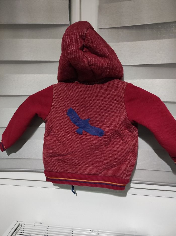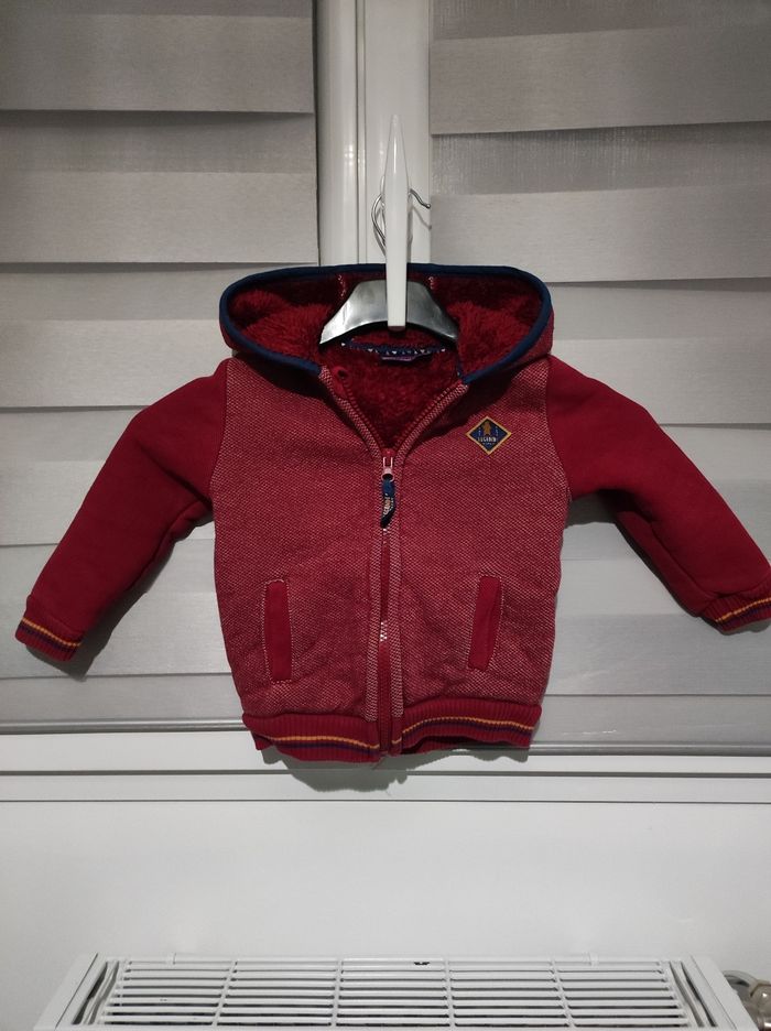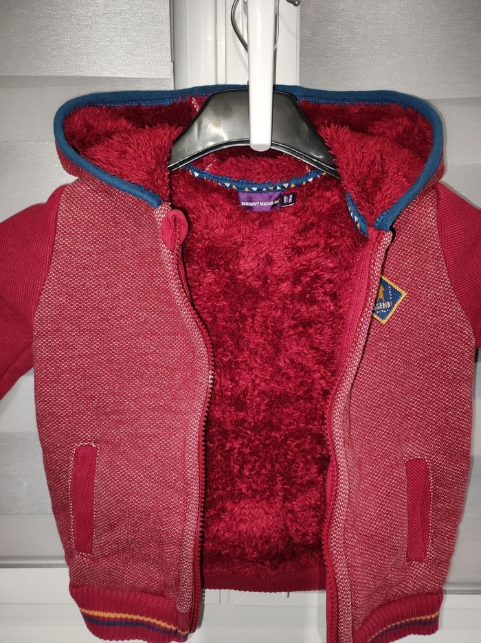 Gilet rouge de la marque sergent major en taille 3 ans(98cm), porté et utilisé, épais avec une capuche, dessin d'un aigle dans le dos, très confortable. Porté souvent à la mi-saison. Il y a un petit accro sur la manche, il présente quelques bouloches d'usure