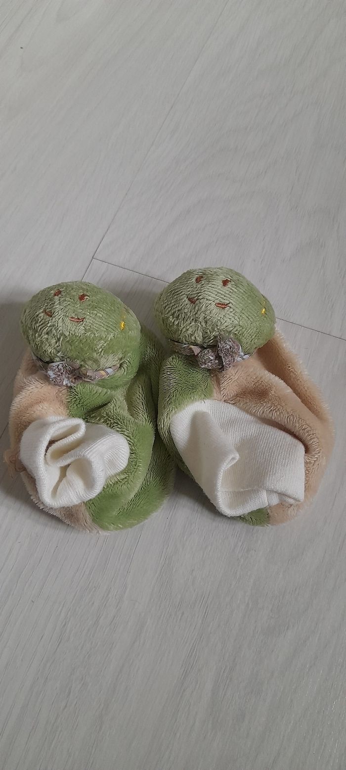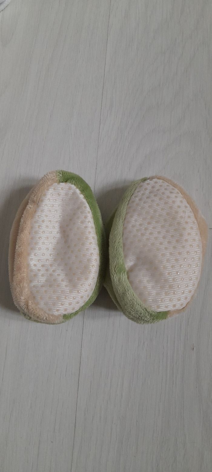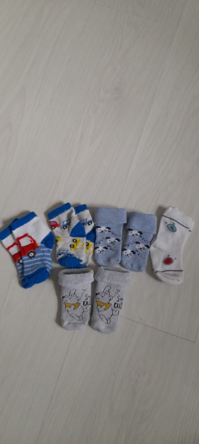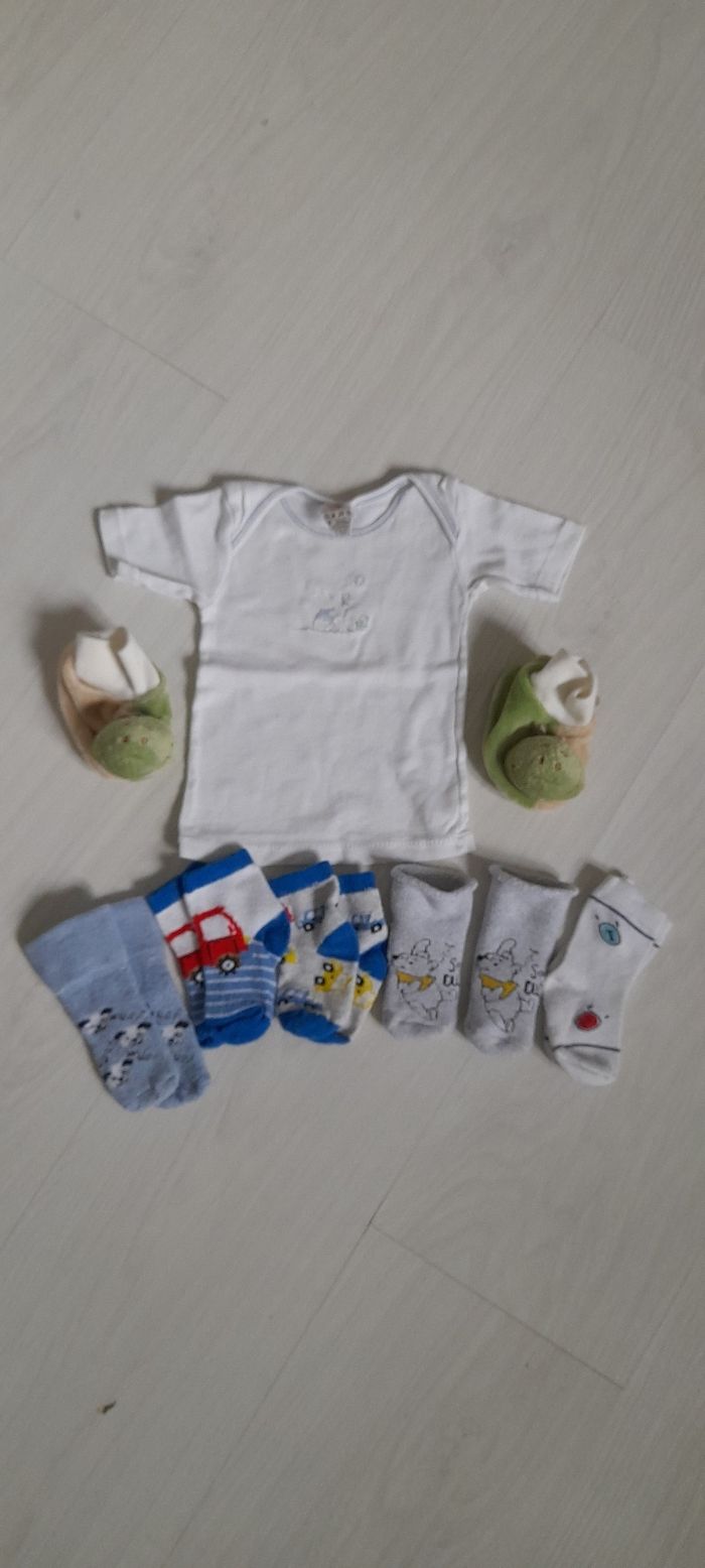 Lot 6 mois Contient 1 haut blanc manches courtes avec motif devant marque ABSORBA/ 5 paires de chaussettes de diferentes couleurs et matières/ 1 paire de chausson hochet ( la tête et un hochet quand l'enfant remue c'est pieds ça fait du bruit) Très très bon état