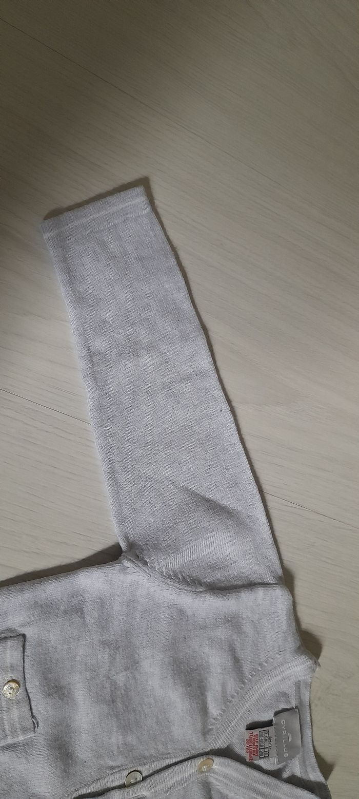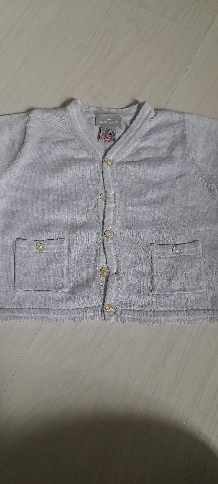 Gilet T 9 mois Marque CYRILLUS Couleur gris clair Manches longues Attache central boutons 2 poches devant avec bouton Très très bon état