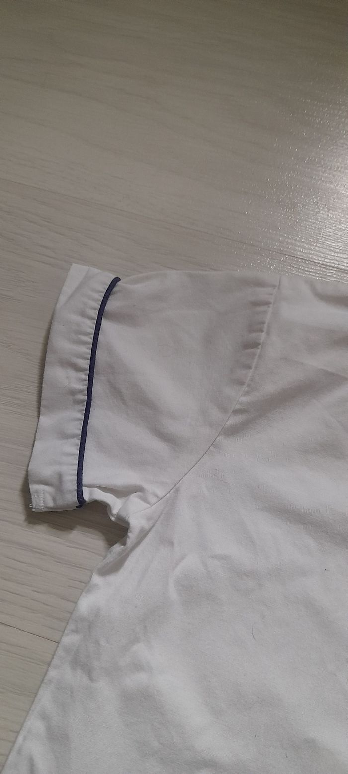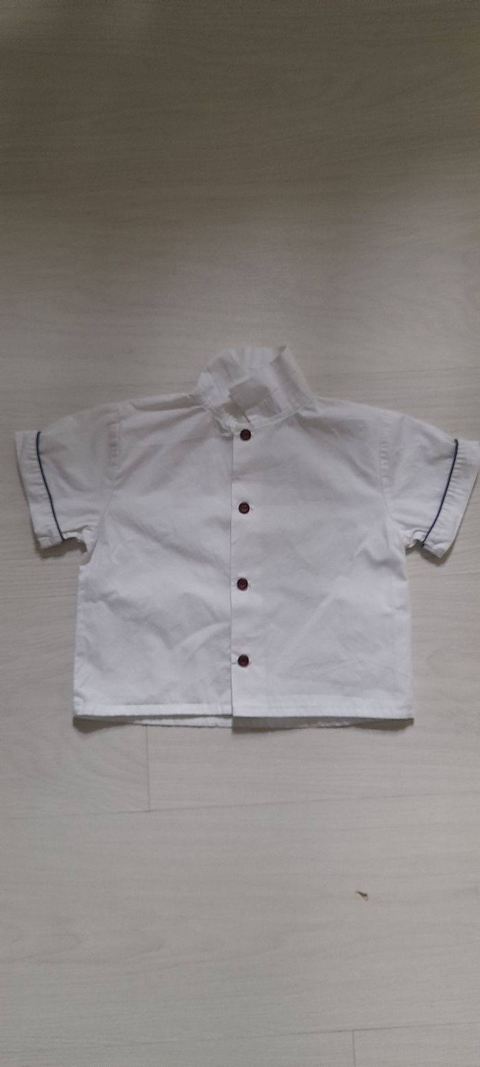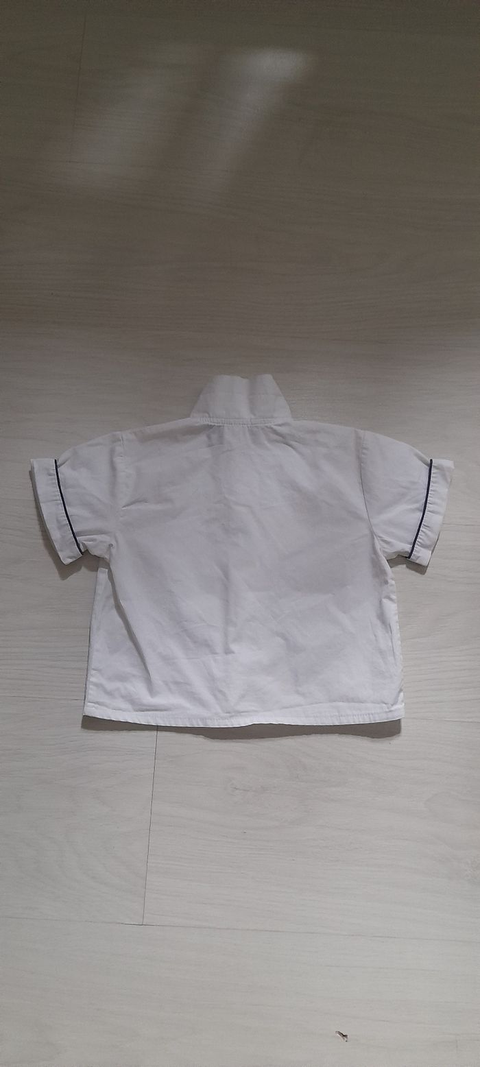 Chemise T 12 mois Marque PHILDAR Couleur blanche avec liseré bleu marine Manches courtes Attache central boutons Très très bon état