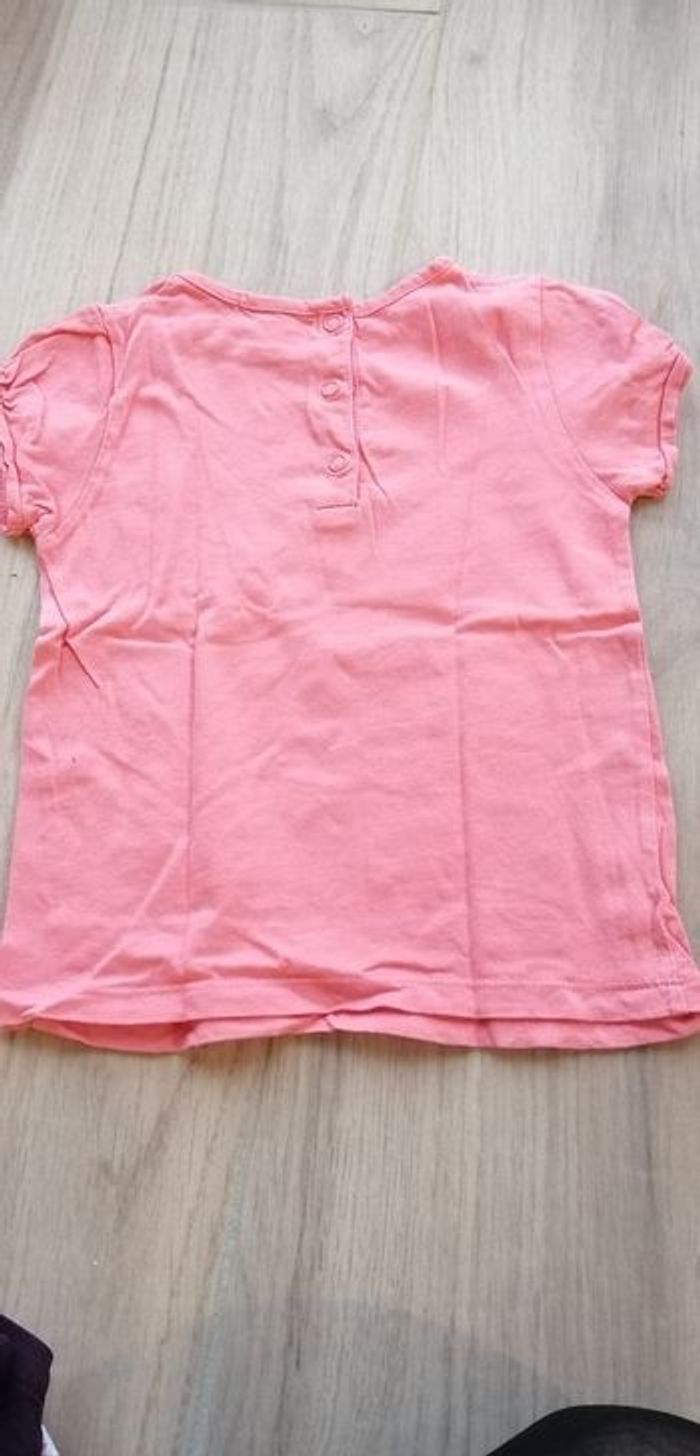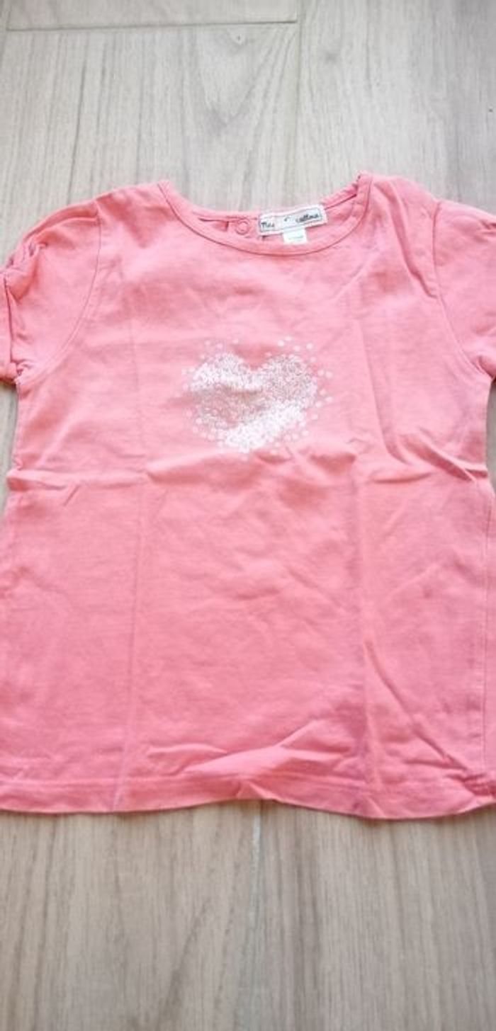 T shirt pour fille taille 24 mois Manches courtes Coloris corail avec cœur milieu Marque mes petits cailloux bon état a été porté mais pas de particularités à signaler