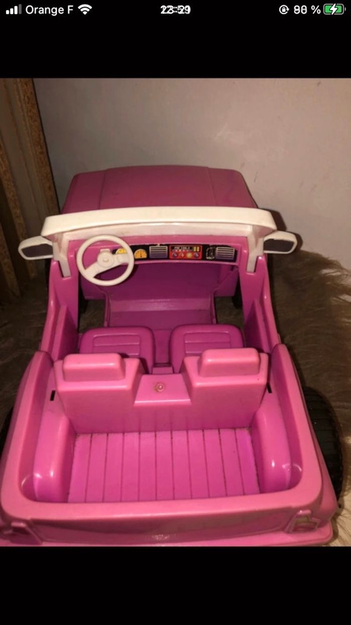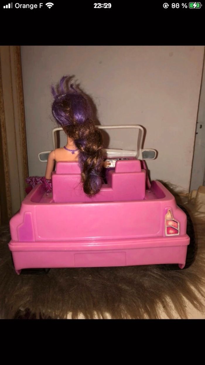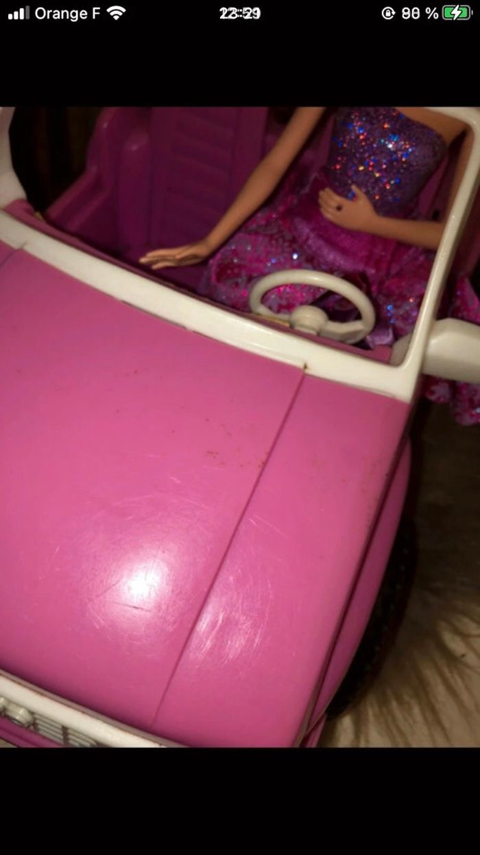 Bonsoir , je vend : - La voiture ainsi que la barbie - Couleur: Rose/Violet - Marque: Aucuns - Bon état , peut tjrs faire plaisir aux enfants - Sur le capot de la voiture y’a des coups mais rien de méchant