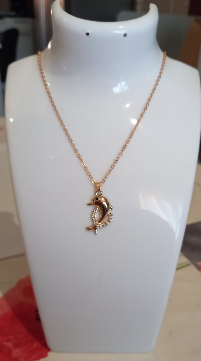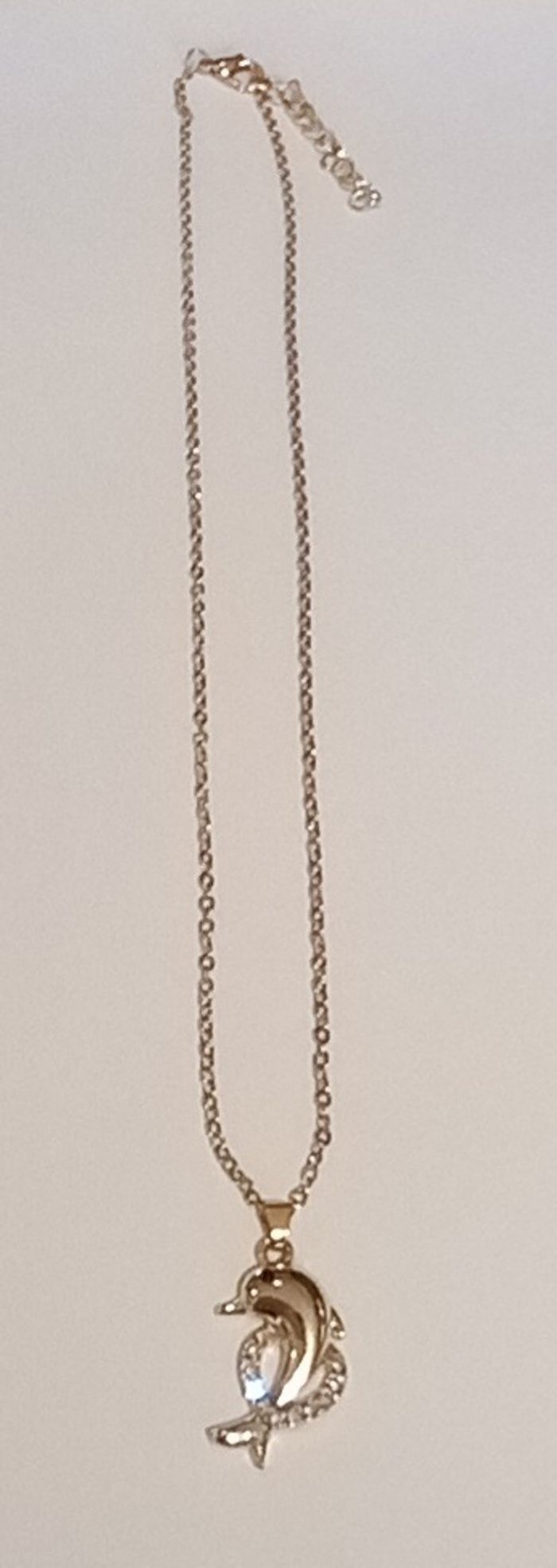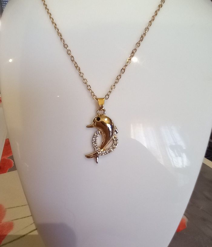 Chaine coloris doré de 42 cms. Dimensions du pendentif dauphin : 2,3 x 1,5 cms. Collier neuf sous blister. N'hésitez pas à regarder mes autres ventes. Envoi rapide et soigné.