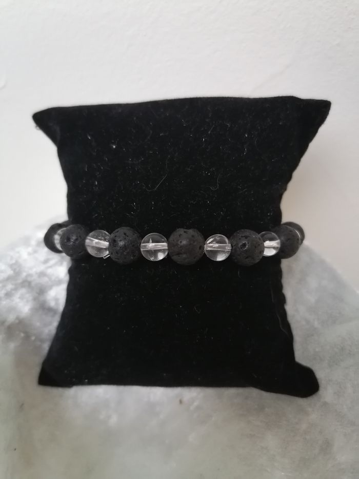 Bracelet en cristal de roche et pierre de lave. La pierre de lave est protectrice, elle apaise les colères aide à la confiance en soi. Le cristal de roche est une pierre d'ouverture spirituelle, elle augmente les vertus des pierres qu'elle côtoie.