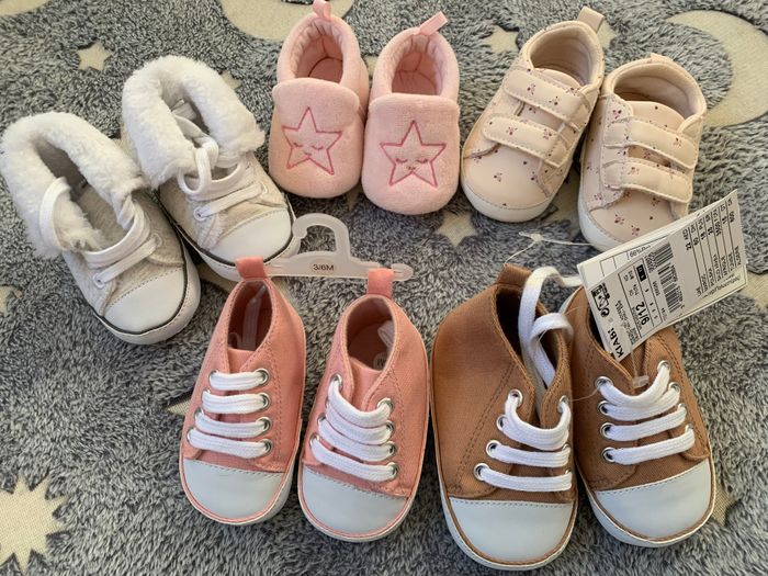 3 paires de 3/6 mois: baskets rose en toile, baskets fourrés grises et tennis rose pâle à fleurs. Une paire de chausson rose étoile Une paire de baskets toile 9/12mois. 2 paires neuves les autres en parfait état