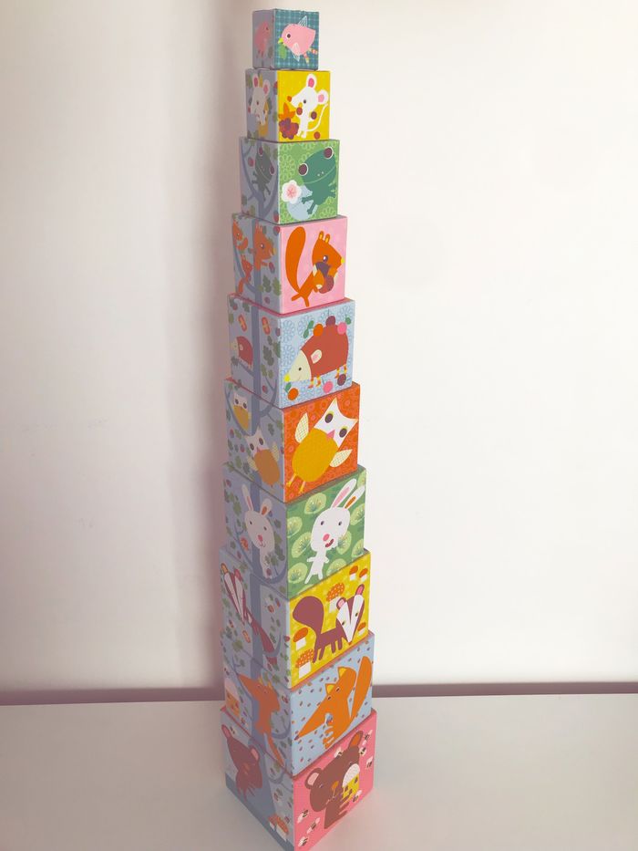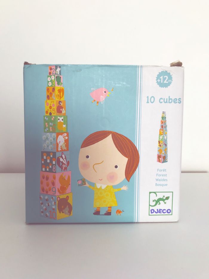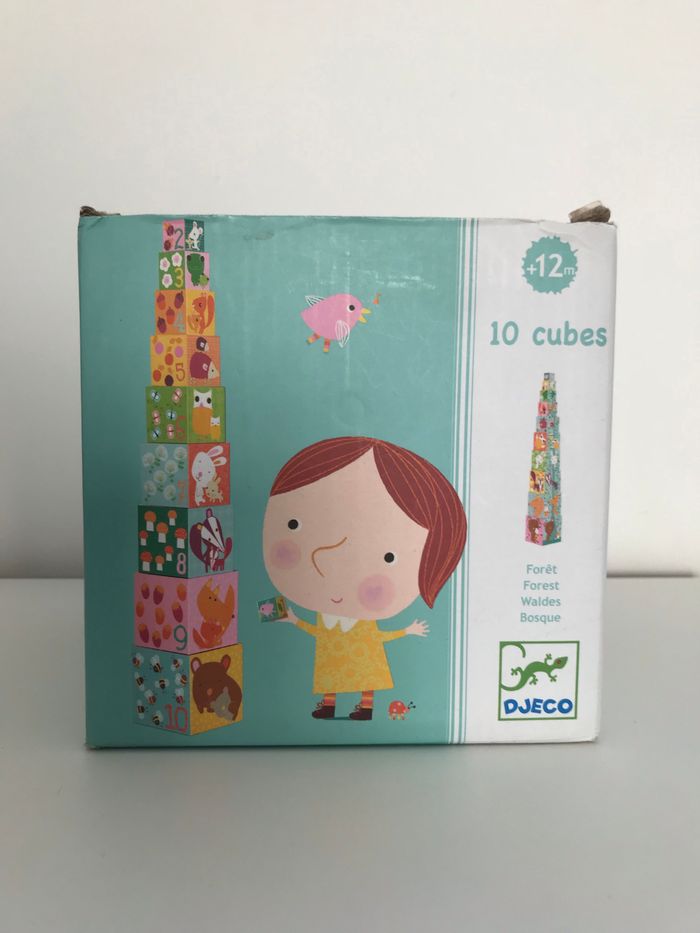 10 cubes à empiler ou encastrer. Différentes faces. 12 mois et plus. Le 1er a été un peu abîmé
