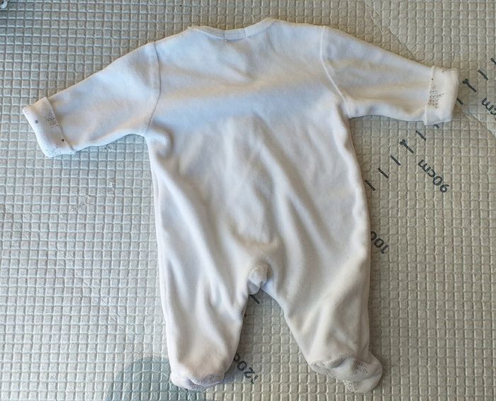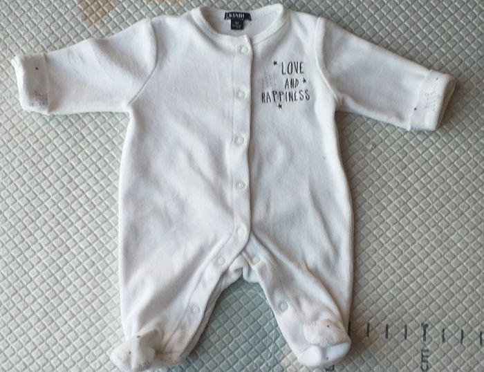 Porté plusieurs fois. Pyjama avec inscription devant. Fermeture devant par boutons pressions. Revers au niveau des manches.