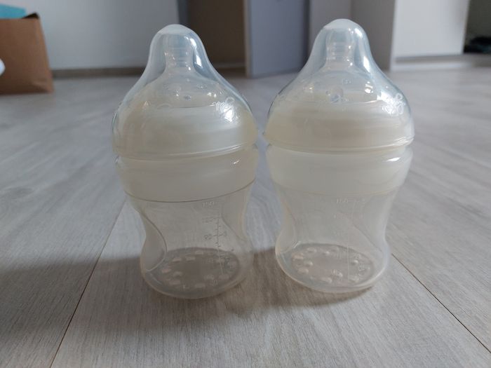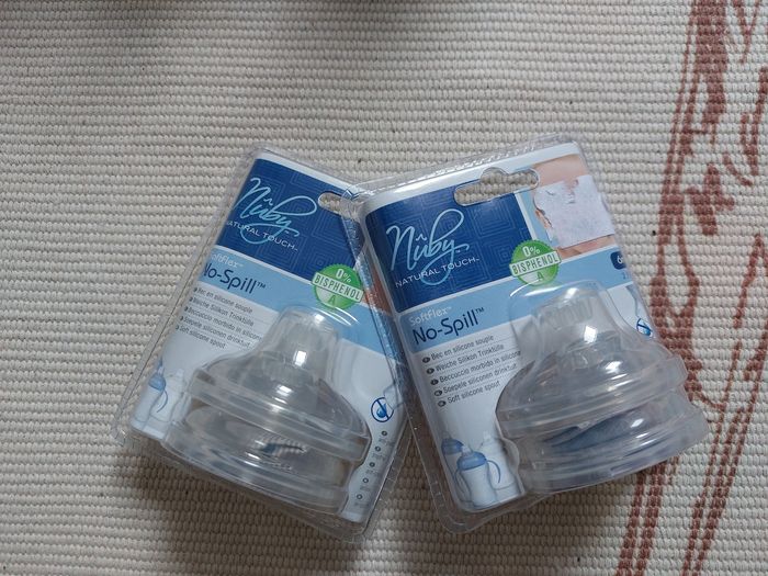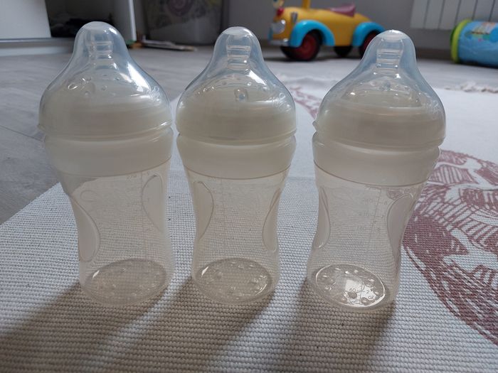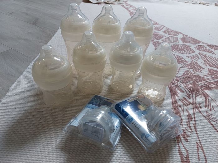 7 biberons nuby 2× 150ml 2× 210ml 3× 300ml 2×2 bec en silicone 6m+ J'ai déballer et stérilité, jamais utilisé car mon bonhomme n'en a jamais voulu
