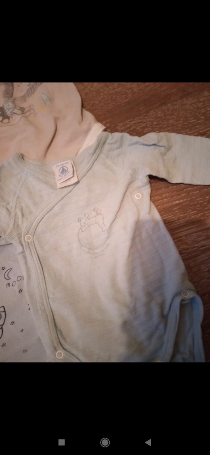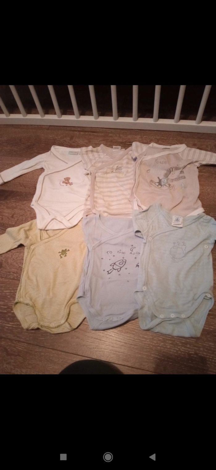 Lot de 6 bodies croisés manches longues taille 3 mois. Plusieurs marques dont petit bateau, Kiabi bébé et mots d'enfant. Deux bleus, un rayé vert, deux gris et un blanc.