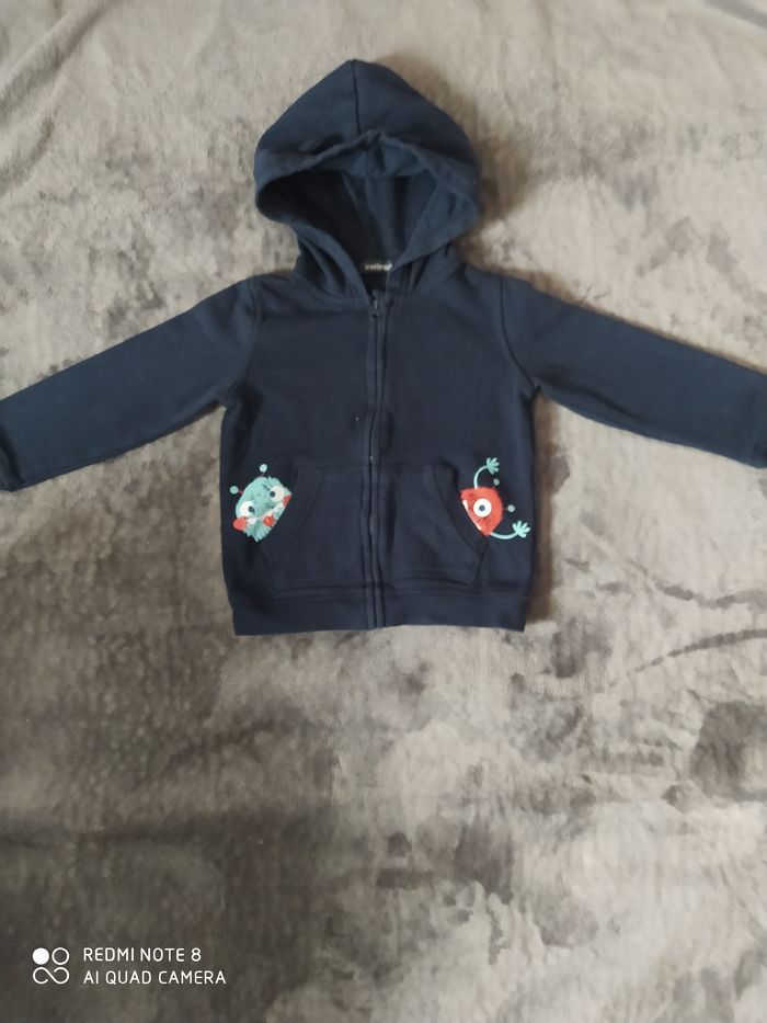 Gilet a capuche zippé, légèrement boulocher mais en très bonne état ? il y a des petites oreilles sur la capuche marque in extenso couleur bleu marine
