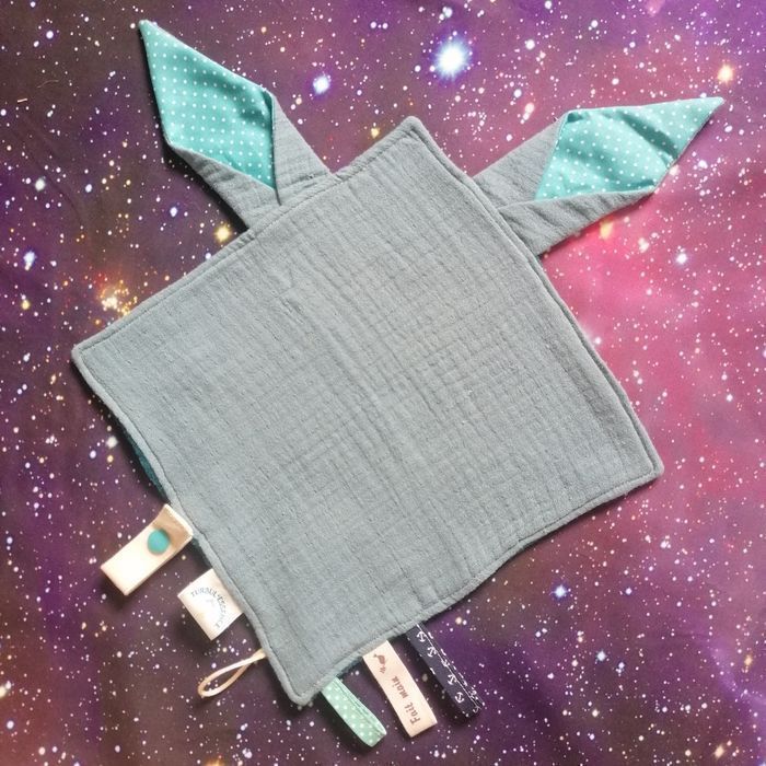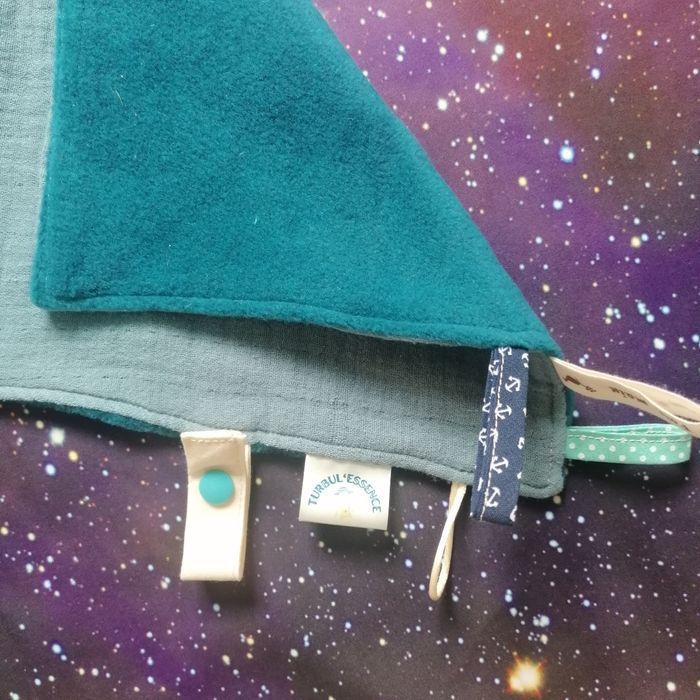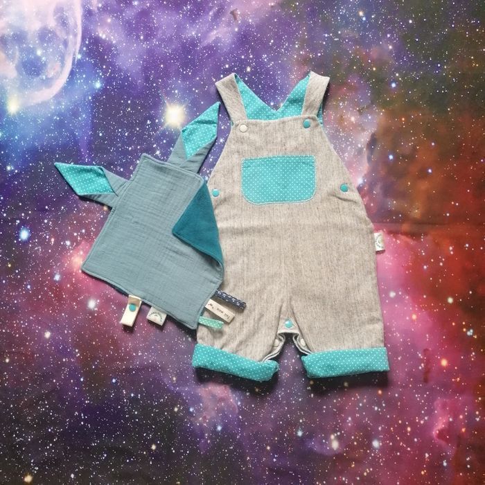 La box "bébé des étoiles" Turbul'Essence est une création faite main en Bretagne unique et originale, elle comprend : - Une salopette évolutive de 3 à 6 mois avec des boutons pressions au niveau de l'entre jambes pour faciliter le change. Tissus certifiés Oeko TeX (sans traitement chimique) Matière sweet à l'extérieur, coton à l'intérieur. - Un doudou "oreilles de lapin" avec des étiquettes pour stimuler le toucher de bébé, avec un attache tétine. - En bonus : si vous le désirez, vous recevrez une méditation guidée par mail, enregistrée par moi-même (je suis également énergéticienne) pour vous accompagner dans votre quotidien de parent et apporter un soutien énergétique à votre enfant pour le sommeil.