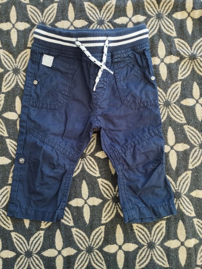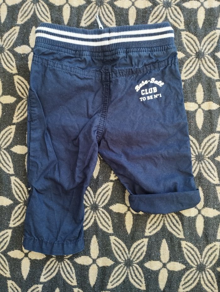 Pantalon en toile taille 6 mois Taille élastiquée + lien de serrage Possibilité de le passer en pantacourt (bouton pression) 📍Très peu porté mais prénom de mon fils écrit sur l'étiquette, je peux coller une étiquette blanche pour vêtements dessus..
