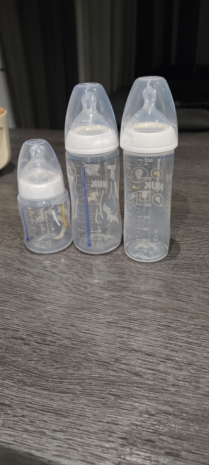 Vend 3 biberons nuk 1 petit 150ml 1 moyen 250ml et un grand 300ml. Casi neuf. Mon fils de 2 mois ne les accepte pas.