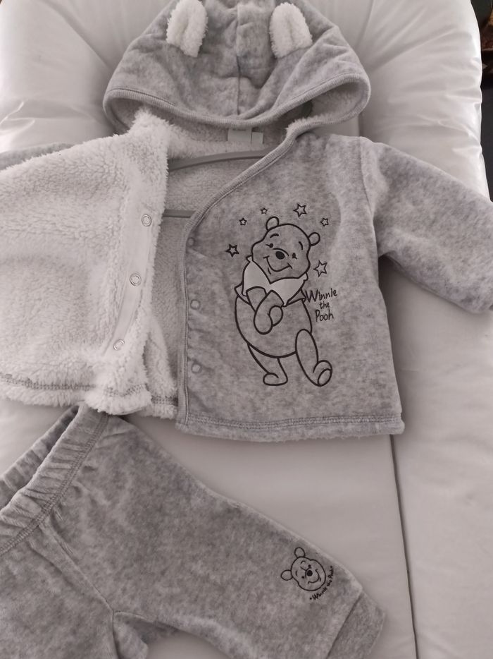 Ensemble veste cache cœur et petit pantalon en velours extérieur et fourré a l'intérieur. Capuche avec petites oreilles d'ourson. Parfait pour finir l'hiver et le début du printemps. Collection Disney Baby. Parfait état