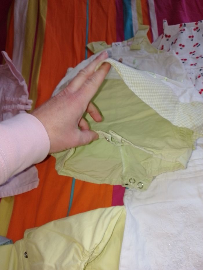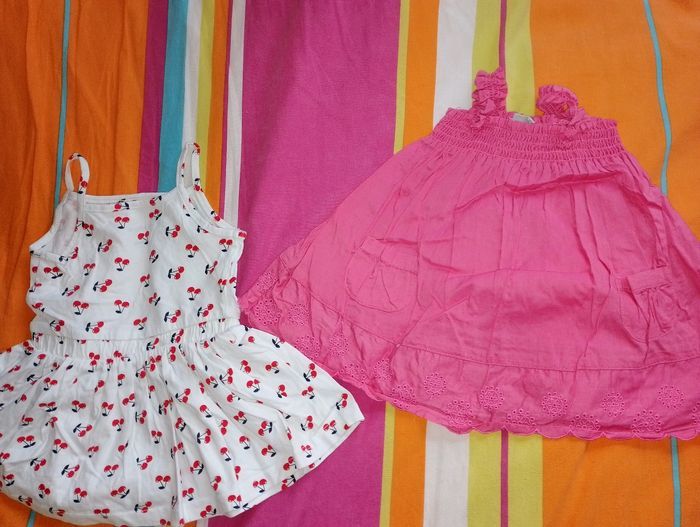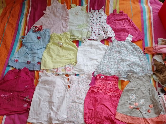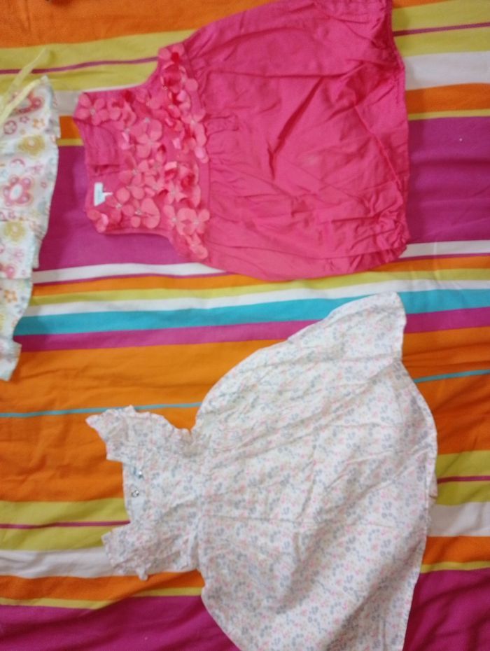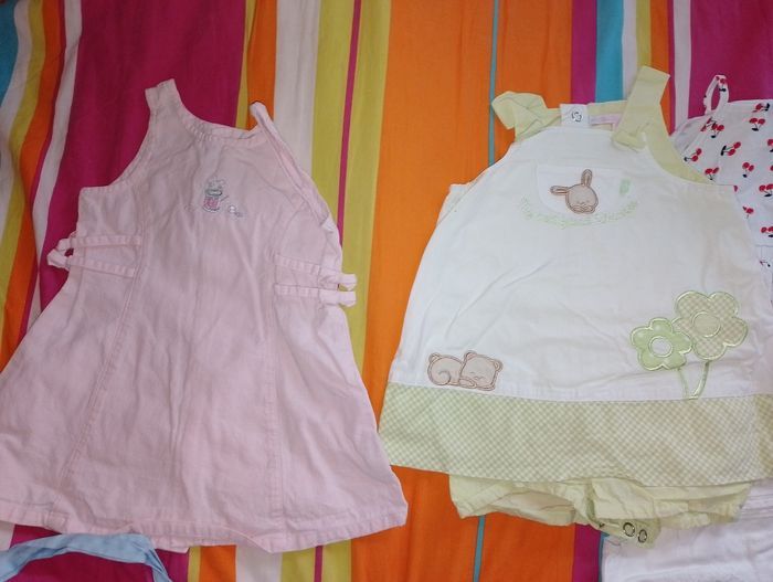 Robe été 6 mois TBE 4€ pièce . Rose avec petite souris Peter rabbit . Combi short balnc et vert petit kimbaloo . Blanche avec cerise pat et ripaton . Robe fine bretelle grain de blé . Bleu Foster neuf . Vert anis (1 point en bas sur le vert) kimbaloo . Blanche grain de blé . Grise avec papillon gris et rose kimbaloo . Rose foncé (rêve) . Rose clair Kong Bear . Rose avec fleur Verbaudet . Rose avec fleur sur le haut obaïbi . Grise et orange avec fleur coeur Baby by Gémo