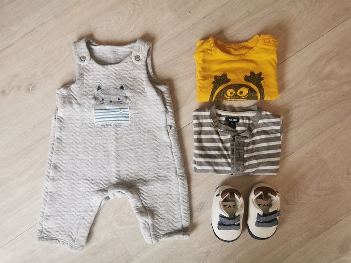 1 salopette Obaïbi 2 tee shirts manches longues (1 petit acco sur le jaune voir photo) 1 paire de chaussure Tao
