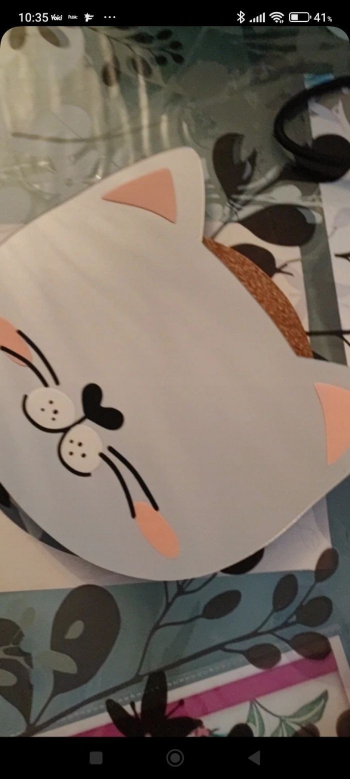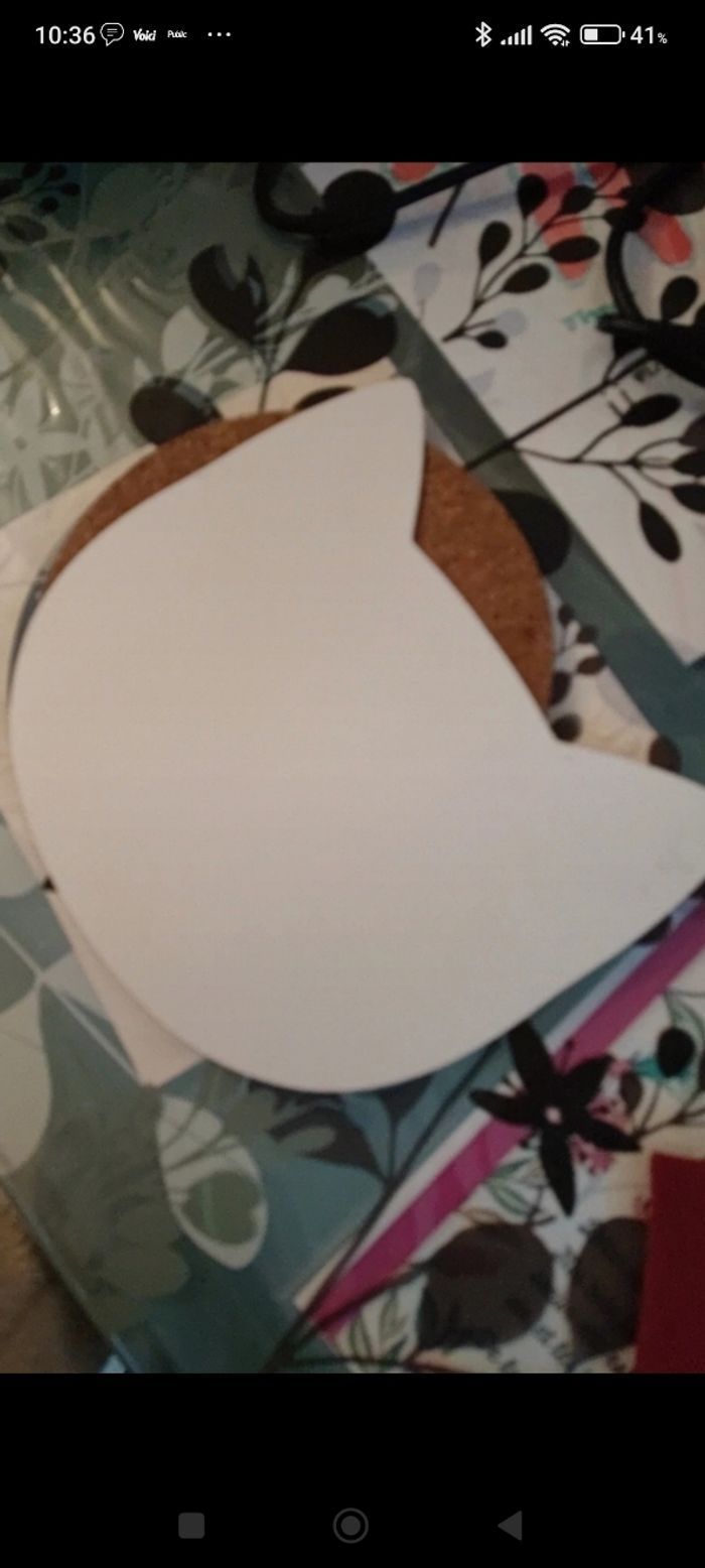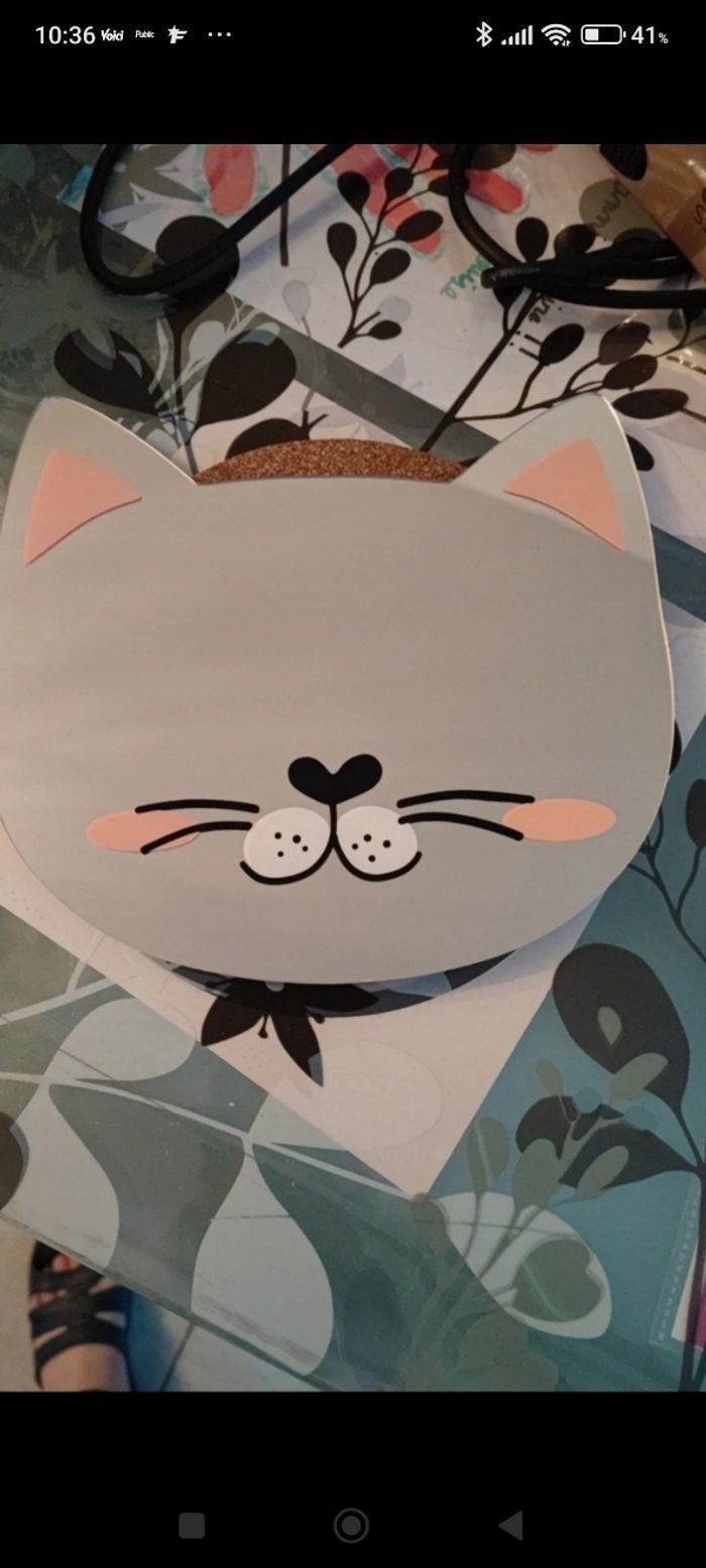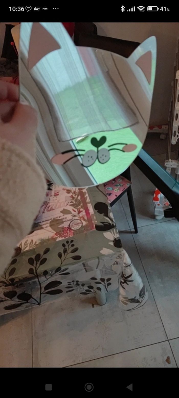 Miroir en forme de tête de chat,en très bon état,un coin de l'oreille à subit un petit accroc Hauteur 22 cm environ Largeur 23 cm environ A poser où à coller avec double face (non fourni)