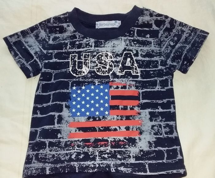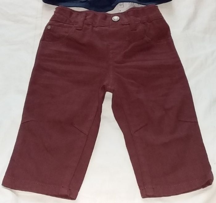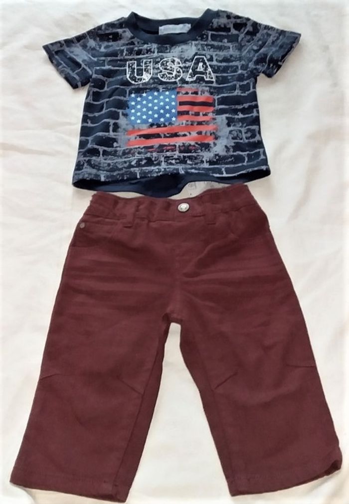 ENSEMBLE 9 MOIS composé d'un tee shirt BARBOUILLAGE et d'un pantalon TEX (neufavecétiquette), large bande élastique à la taille, tissu un peu épais