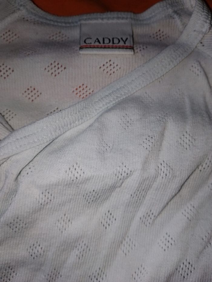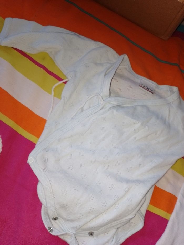 Body 3 mois . Bleu cache coeur CADDY 2 euro . Blanc Manche longue avec col Kiabi bébé 3 mois 3€ . Lot de 4 blanc fine bretelles Kiabi 3 mois 12€ comme neuf, juste lavé (dont 1 body en 6 mois) . Rose a rayures fine bretelles 3€