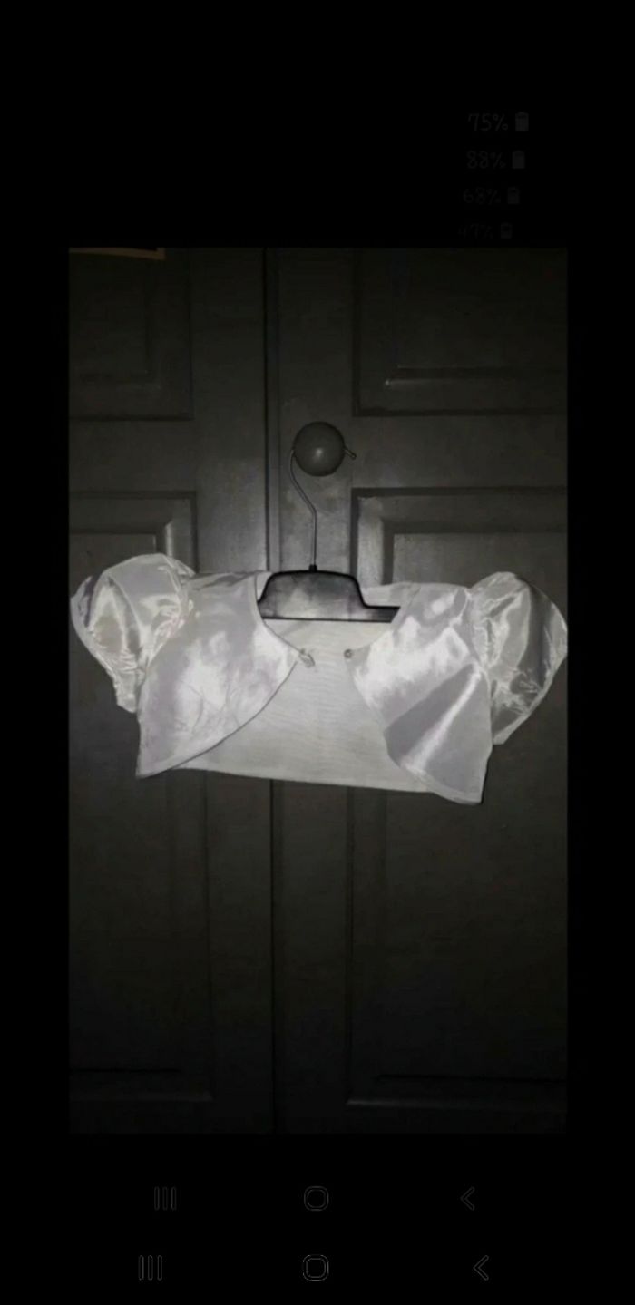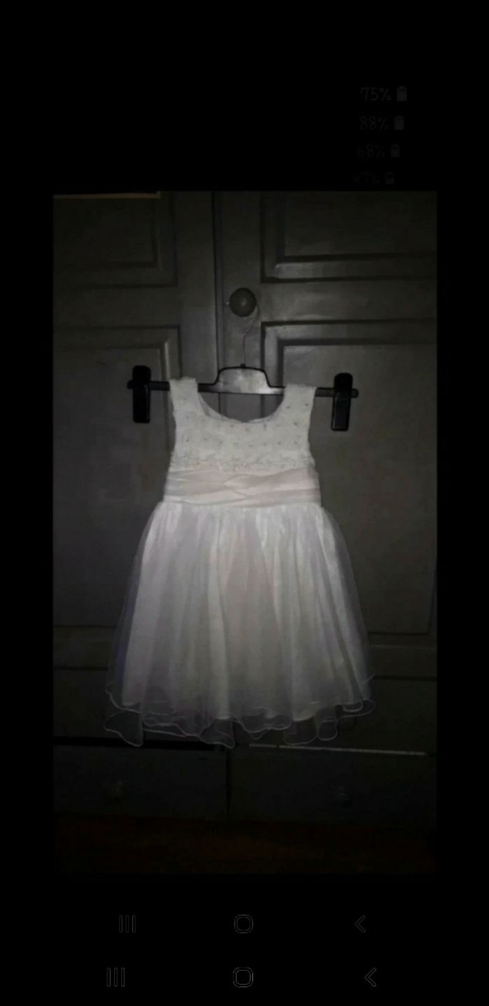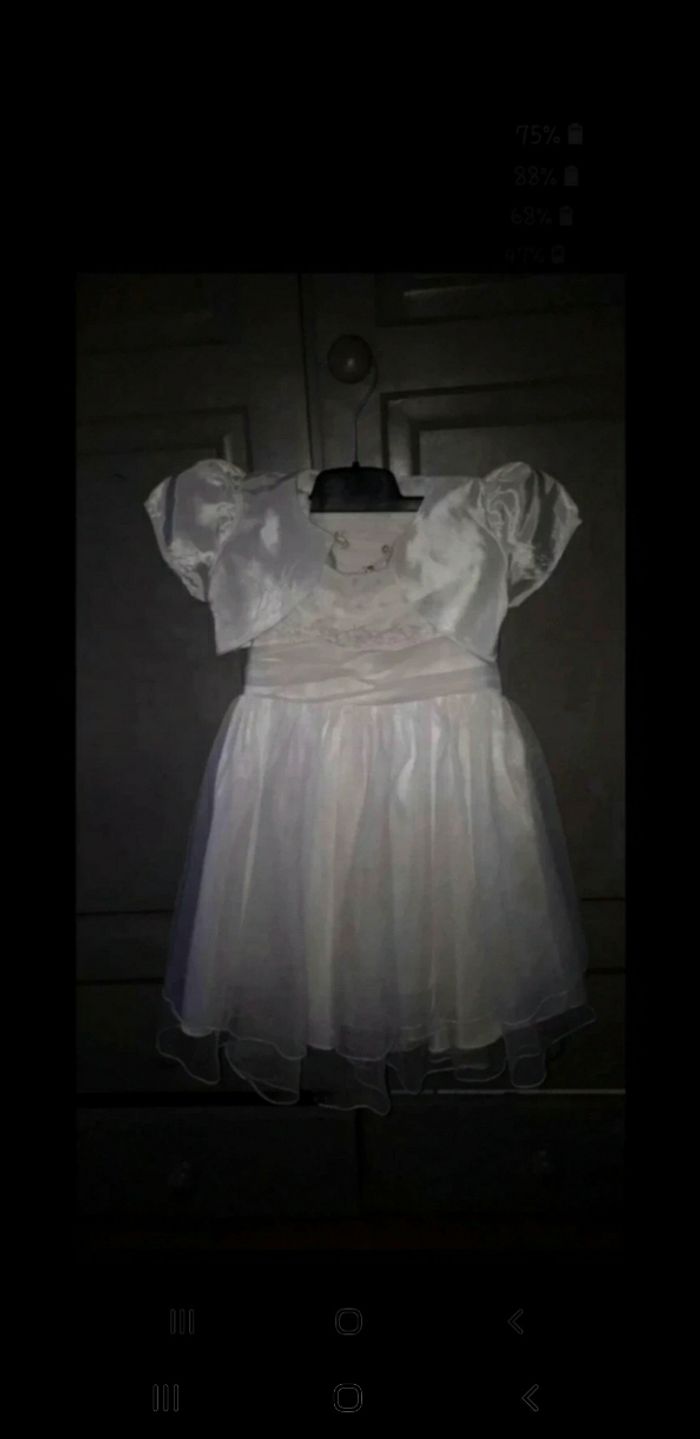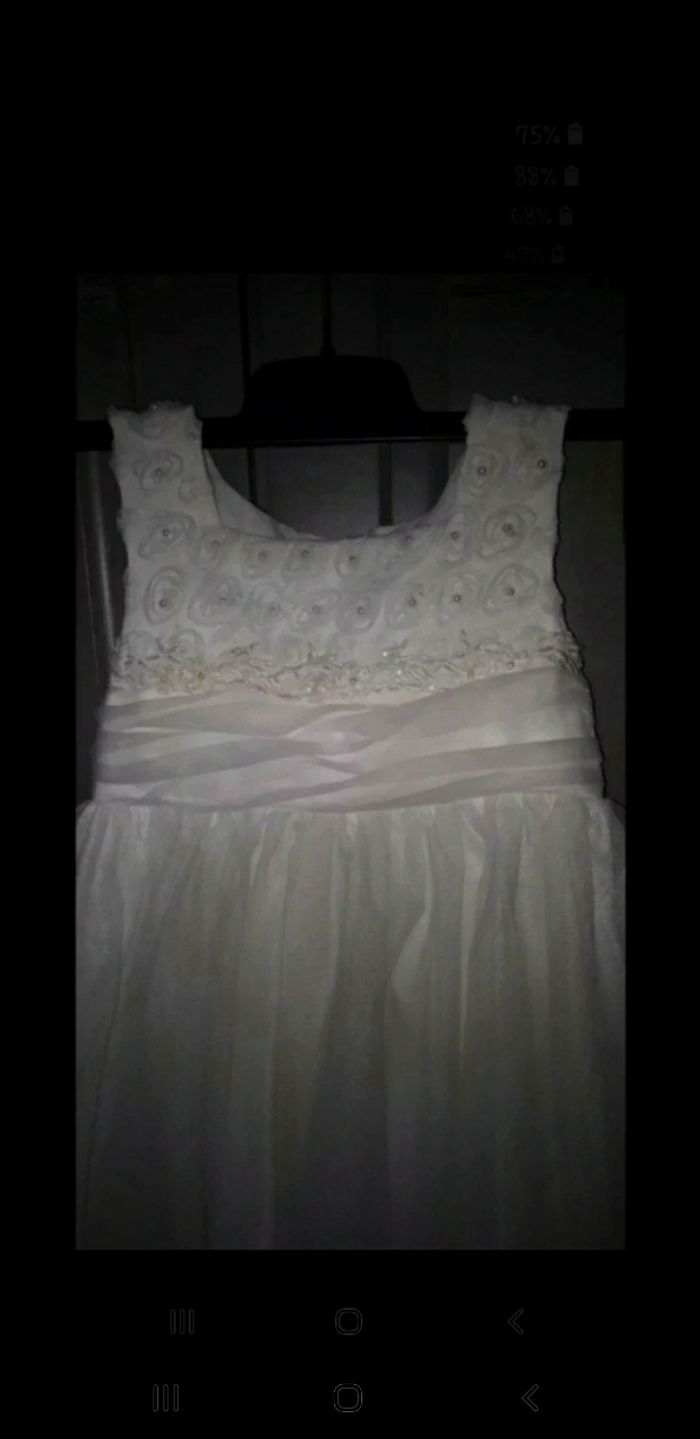 Belle robe pour un mariage, baptême, cocktail... Haut motif petit tourbillon avec coeur de perle, fleurs, petites perles, voile Au dos beau noeud Crochet et fermeture éclair qui fonctionne parfaitement bien Minuscule accroc au niveau du tule, voir photo( qui ne se voit pas une fois la robe portée ) Je donne un boléro acheté à part car il y a le lien qui s'éfiloche, voir photo 60 cm de hauteur #24/36filleevaura76