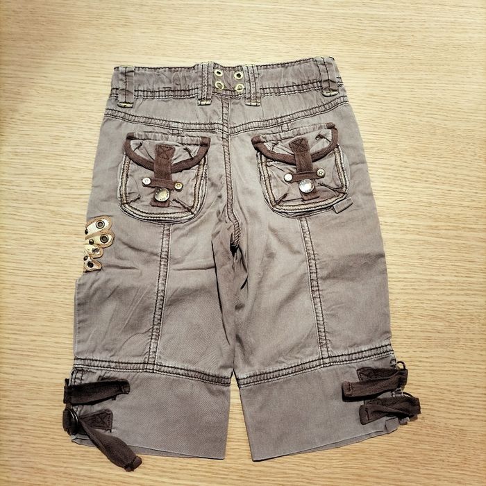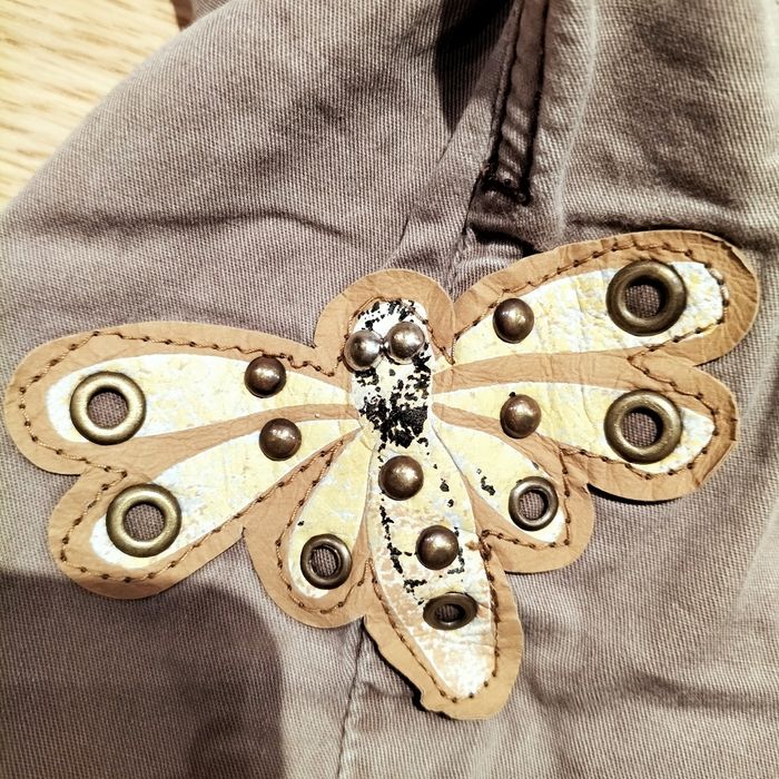 Bermuda long ou pantacourt pour fille, marron, avec un motif papillon des surpiqûres et des ajouts de rubans à différents endroits. En bon état.